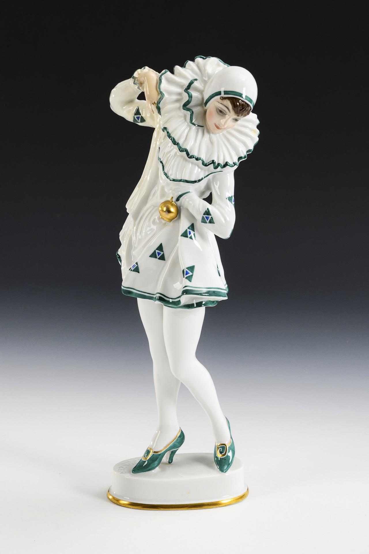 Auf einem ovalen Sockel stehende Tänzerin im Kostüm einer Pierrette, eine goldene Kugel mit der linken Hand haltend