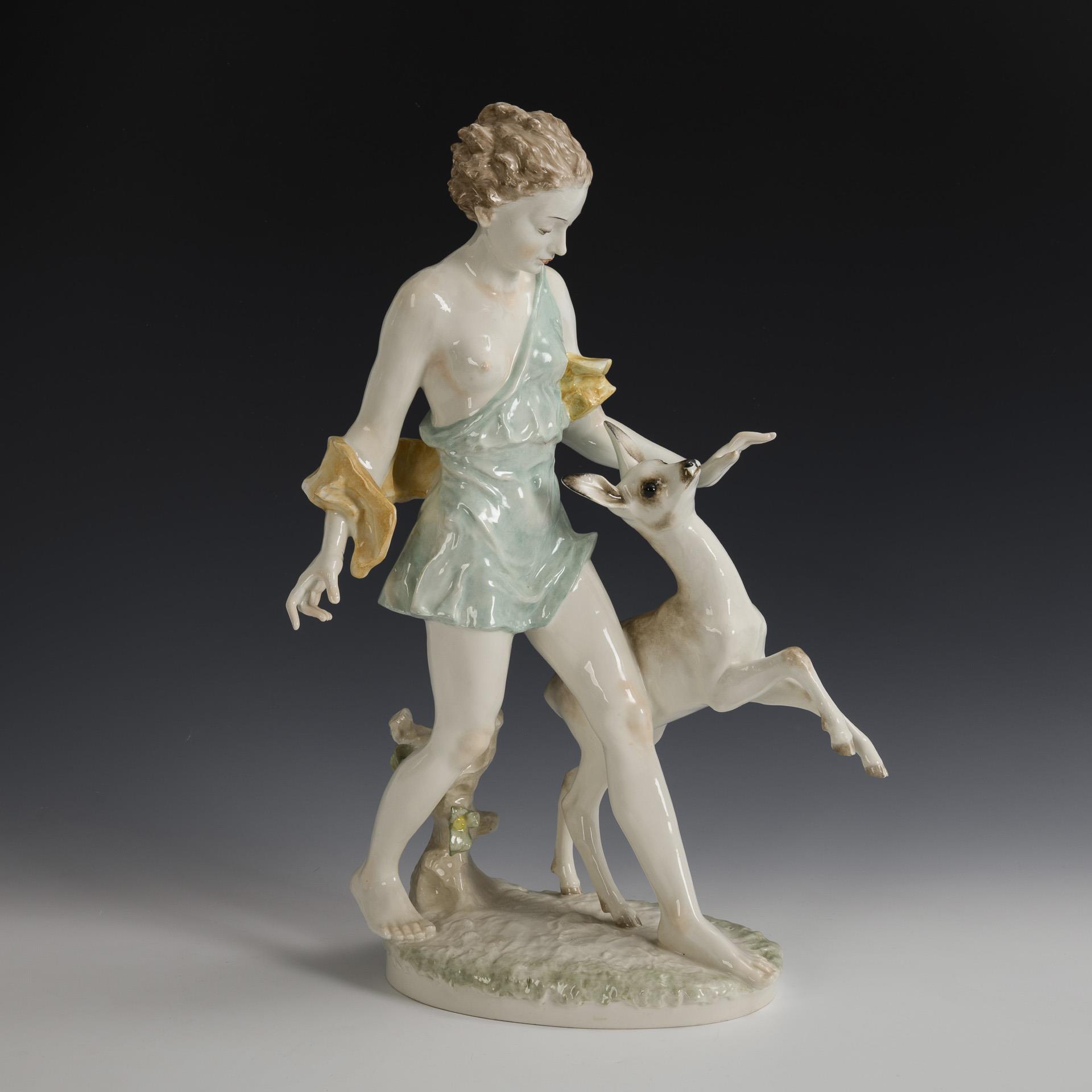 1x HUTSCHENREUTHER, 1918-1938: Art-déco-Figur eines Frauenaktes auf einer Gazelle. / 1x AELTESTE VOLKSTEDTER, 2. H. 20. Jh., Entwurf um 1920/21 von Dorothea Charol (1889-1963) für die Schwarzburger Werkstätten: auf einer Ovalplinthe stehende junge Frau mit großem Rüschenkragen