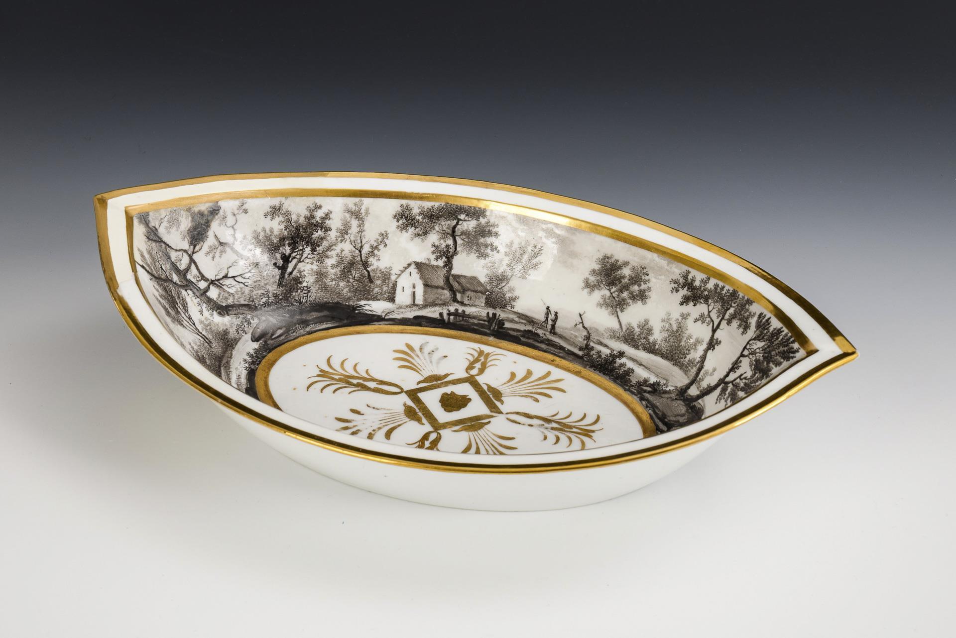 Spitzovale Schale mit schwarzlotgemalter Landschaftsmalerei und reicher Goldstaffage