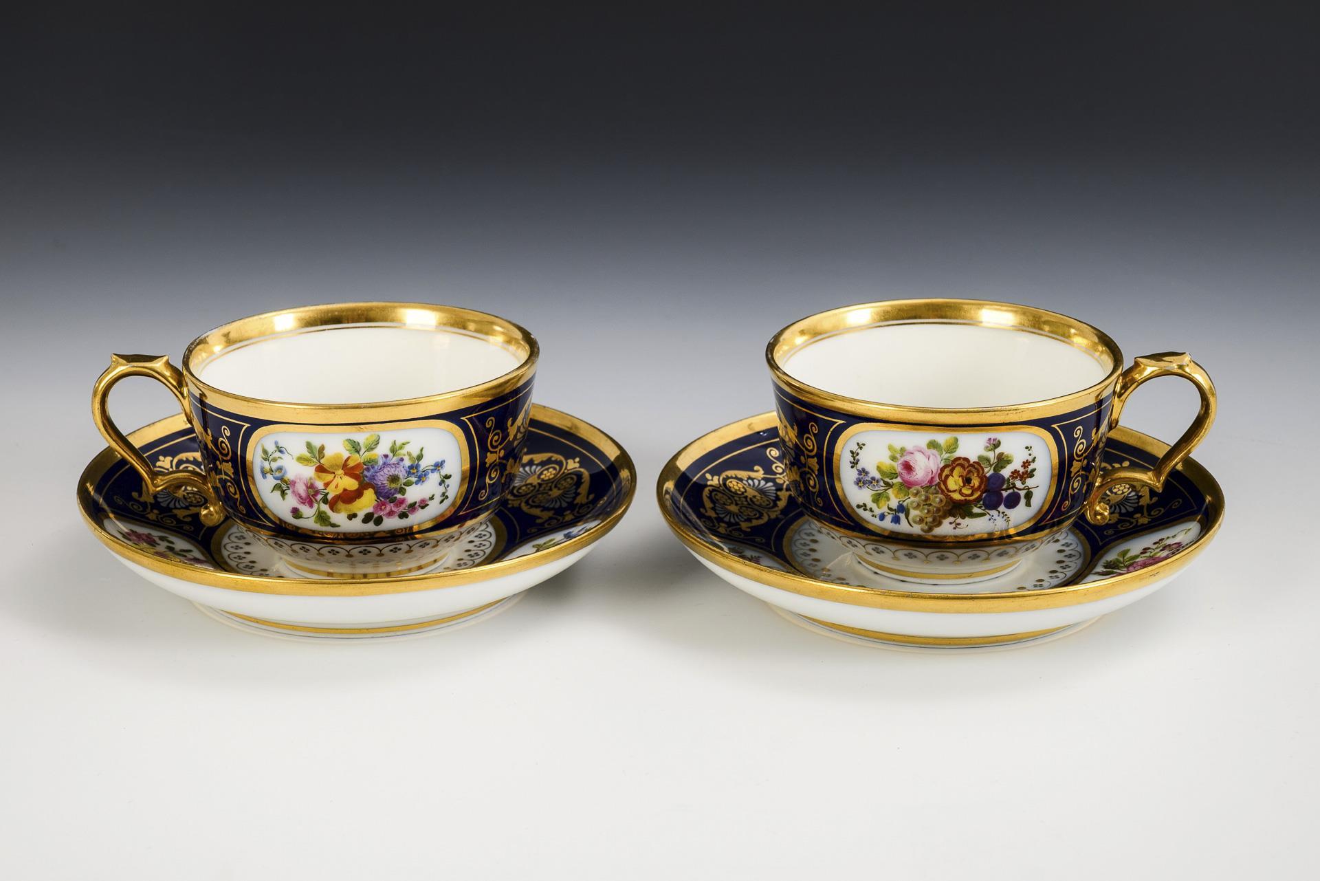 Zylindertassen mit Ohrenhenkel. 1x schauseitig die polychrom gemalte Darstellung einer Parklandschaft mit Gedenkstein, darauf die Widmung "Geweiht dem schönen Tage," ( Tasse) "Ihrer Geburt" (Untertasse). / 1x schauseitig eine sepiagemalte Parklandschaft mit Gedenkstein, darauf die Aufschrift "Gedenke der Freundin" (Tasse) "Freundschaft, Liebe, reicht er dir"