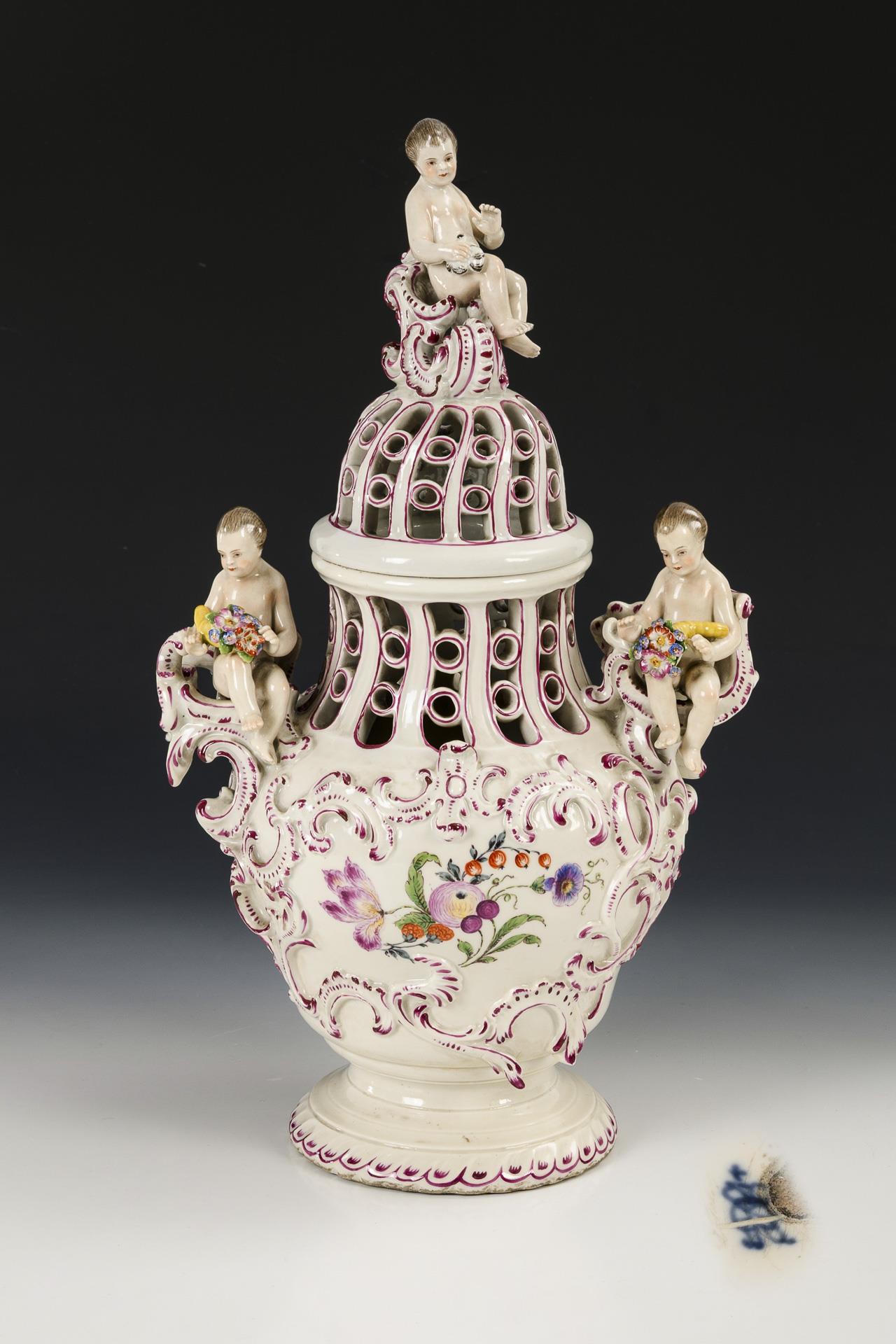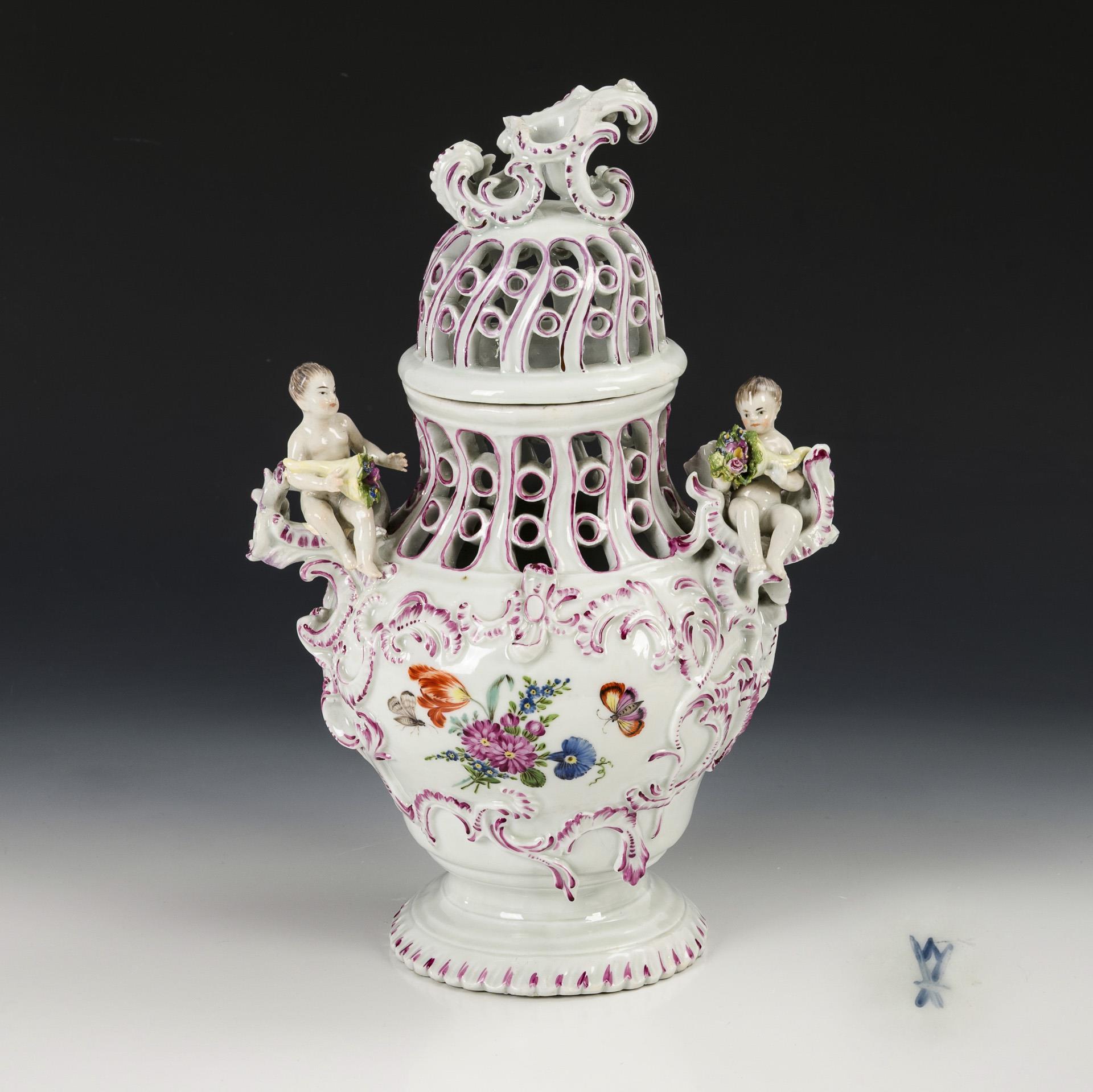 Balustervase mit durchbrochenem Hals, durchbrochenem Deckel, zwei auf den Handhaben sitzenden Putten mit Füllhorn, Rundfuß. Auf der Wandung Blumen- und Insektenmalerei in Rocaillereliefkartuschen.