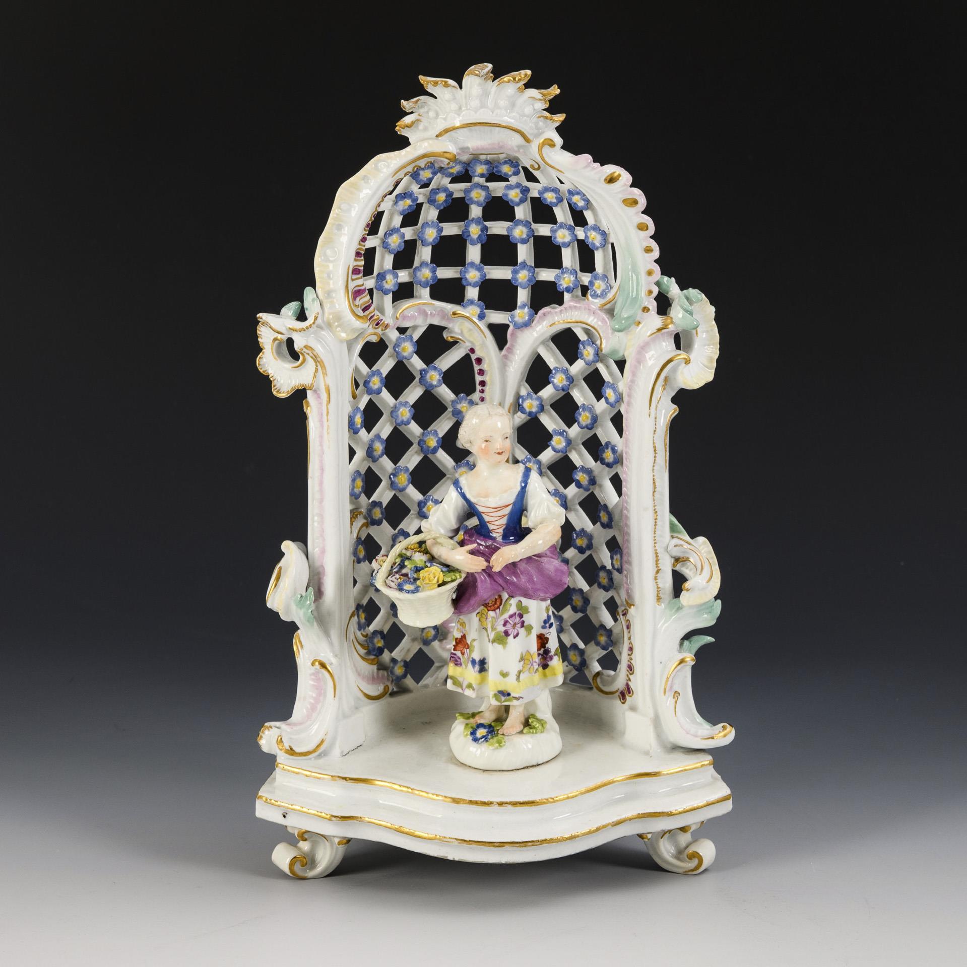 Gitterdurchbrochene Laube mit Rocaillezier, auf getrepptem Sockel mit drei Rocaillefüßen, darin ein Gärtnermädchen mit Korb stehend