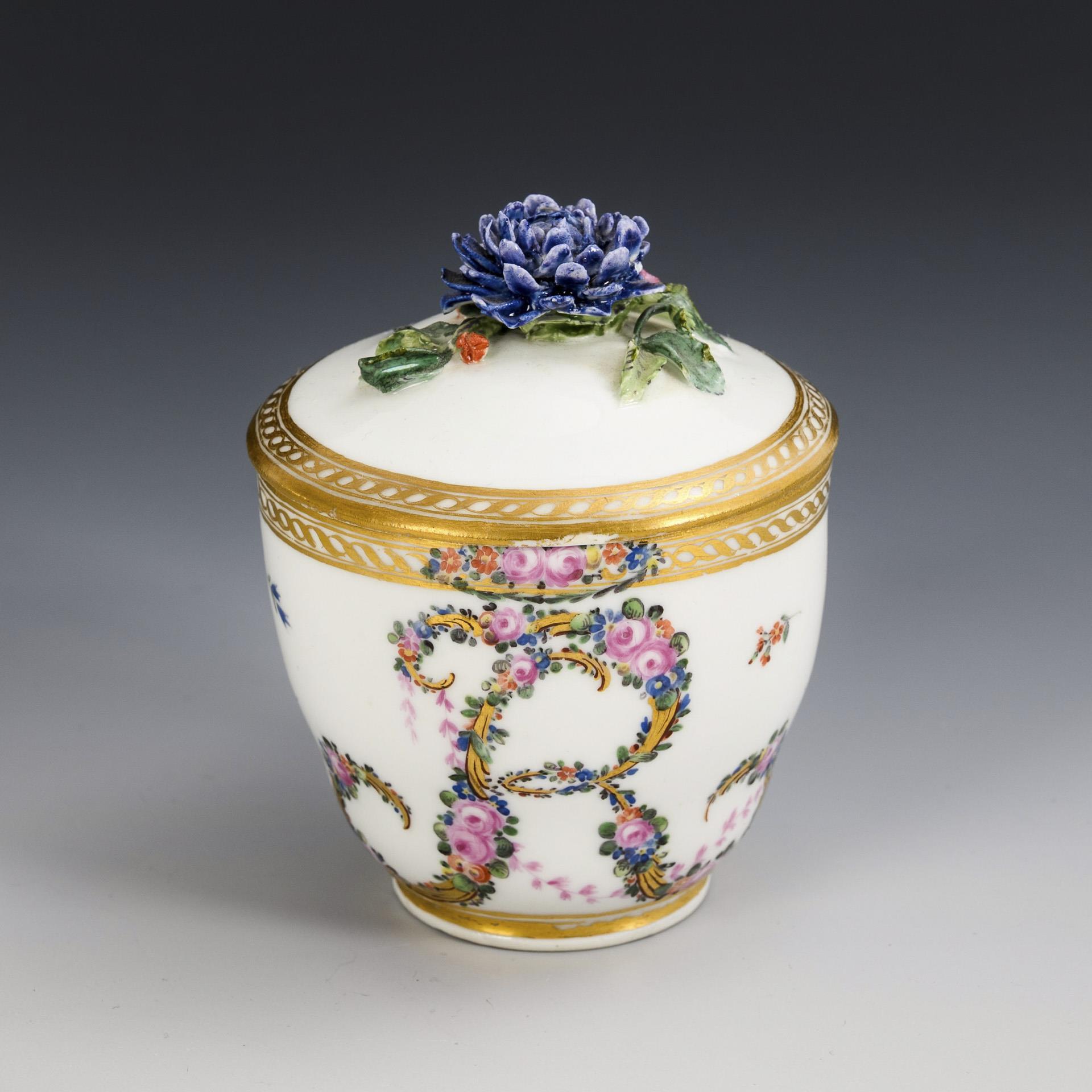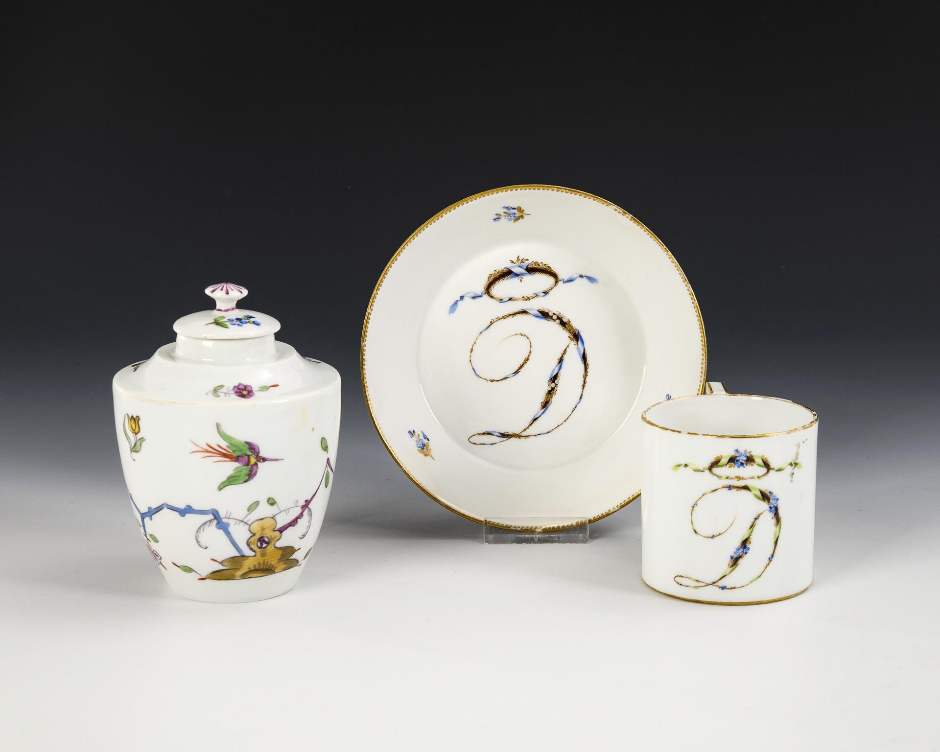 1x ovoide Dose mit Knaufdeckel und Fels- und Vogelmalerei. / 1x Zylindertasse mit gewinkeltem Henkel und Untertasse: schauseitig der aus gemalten Haaren, grünem Band und Vergissmeinnichtblüten gebildete Buchstabe "D"