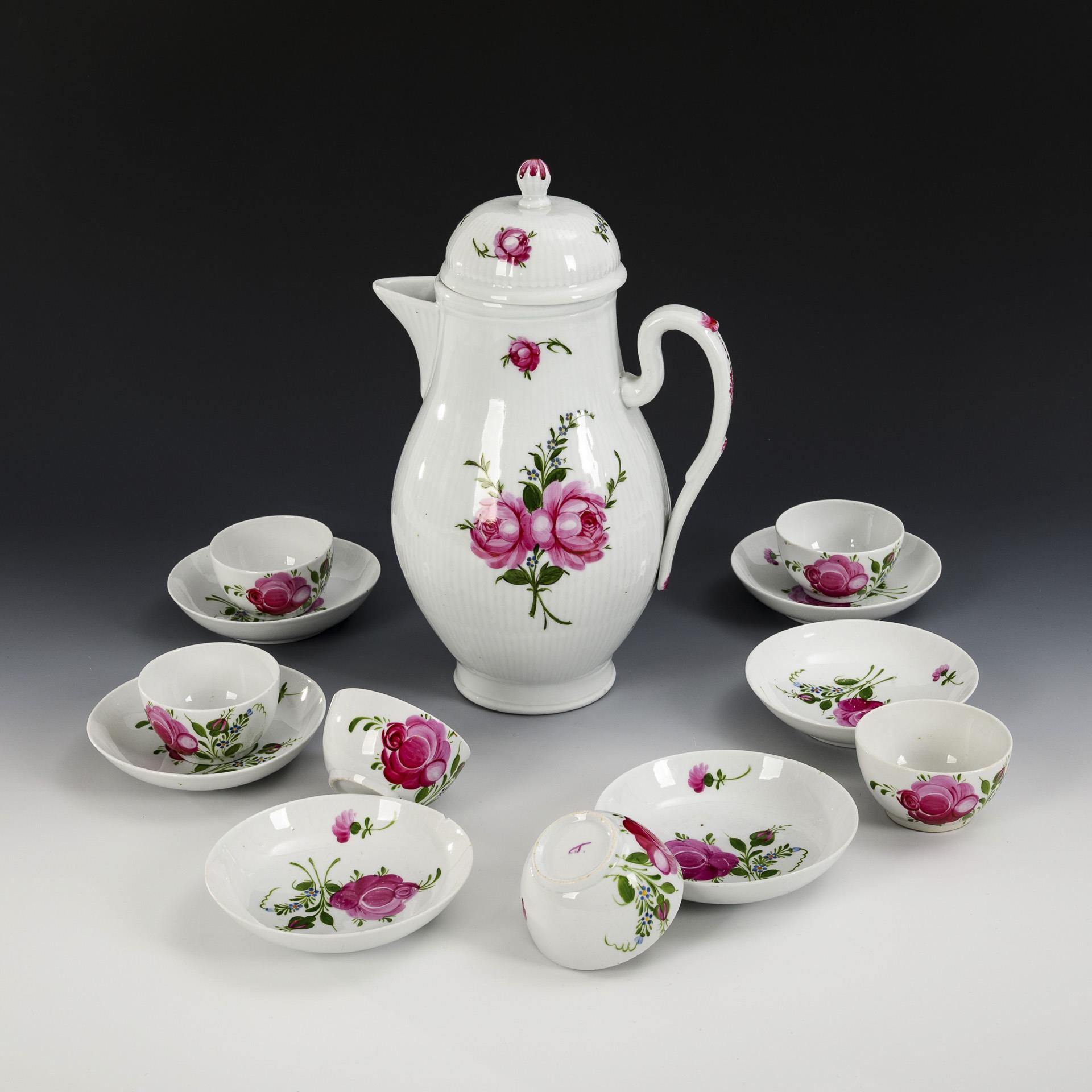 24 Teile. Teekanne (H 13 cm), Birnkännchen (H 14,5 cm), Zuckerdose, 5 Kaffeetassen (H 6,5 cm), 7 Koppchen (H ca. 4,5 cm), 8 Untertassen (Ø 12,5-13 cm) und 1 Vierpassschale (L 17,5 cm)