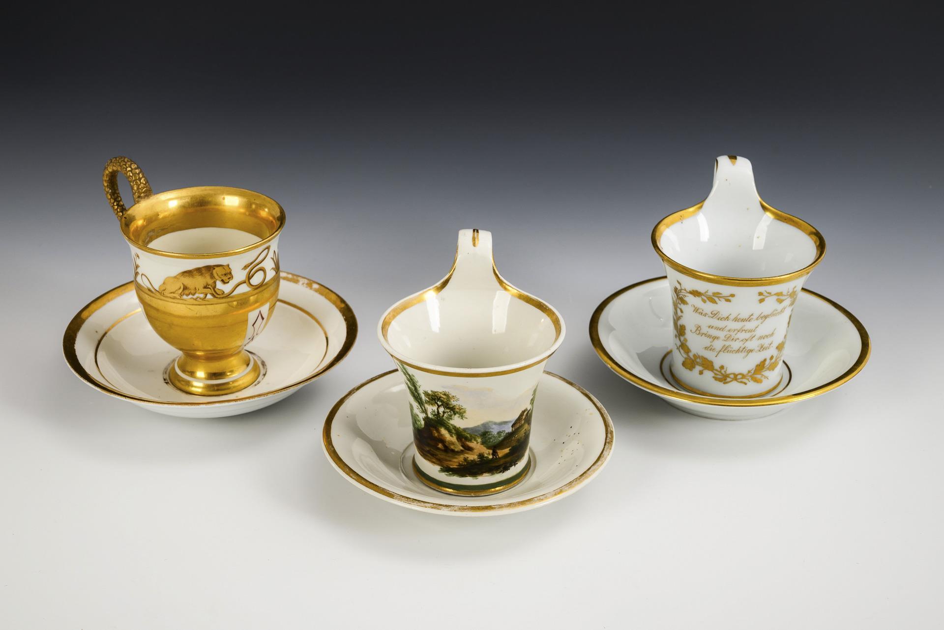 1x ungemarkt: gefußte Glockentasse mit Delfinhenkel und Goldmalrerei. / 2x Fürstenberg: konische Tasse mit Campanerhenkel und der goldenen Aufschrift "Was Dich heute beglückt und erfreut Bringe Dir oft noch die flüchtige Zeit." und konische Tasse mit Campanerhenkel und Landschaftsmalerei