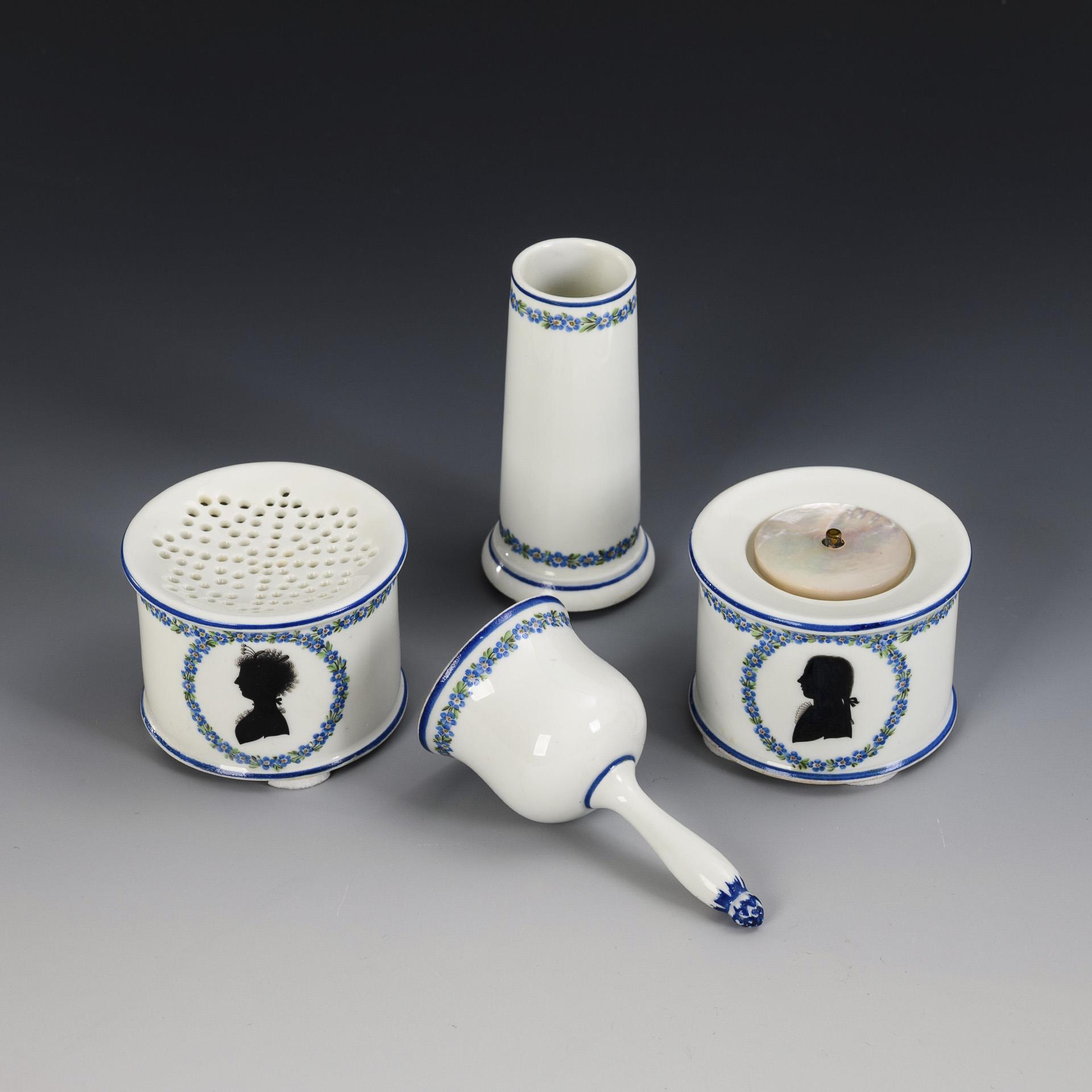 1x 1774-1814: bauchige Tasse mit Ohrenhenkel (H 4,5 cm) und Untertasse (Ø 13,5 cm). / 2x um 1820: Suppenteller (Ø 23 und 23,5 cm)