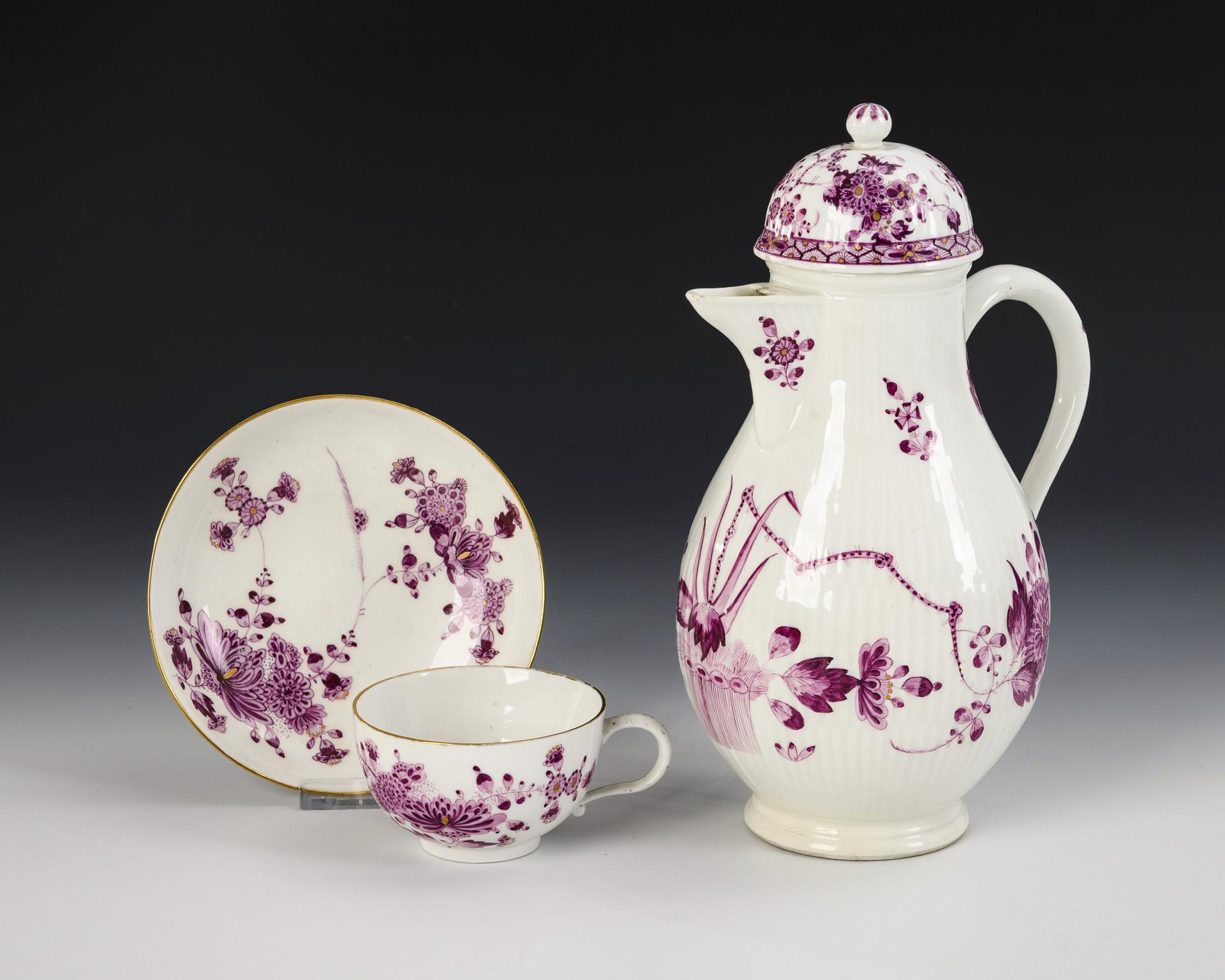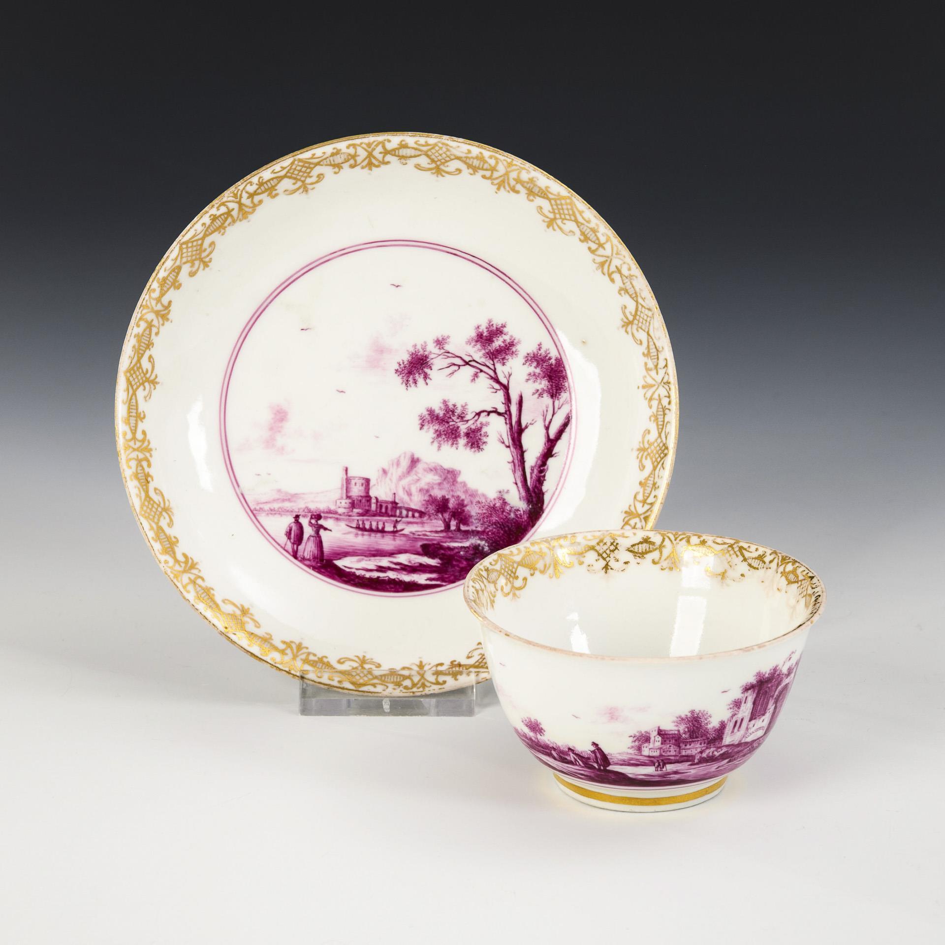 Barocke Kanne und Tasse mit Purpurmalerei. Meissen.
