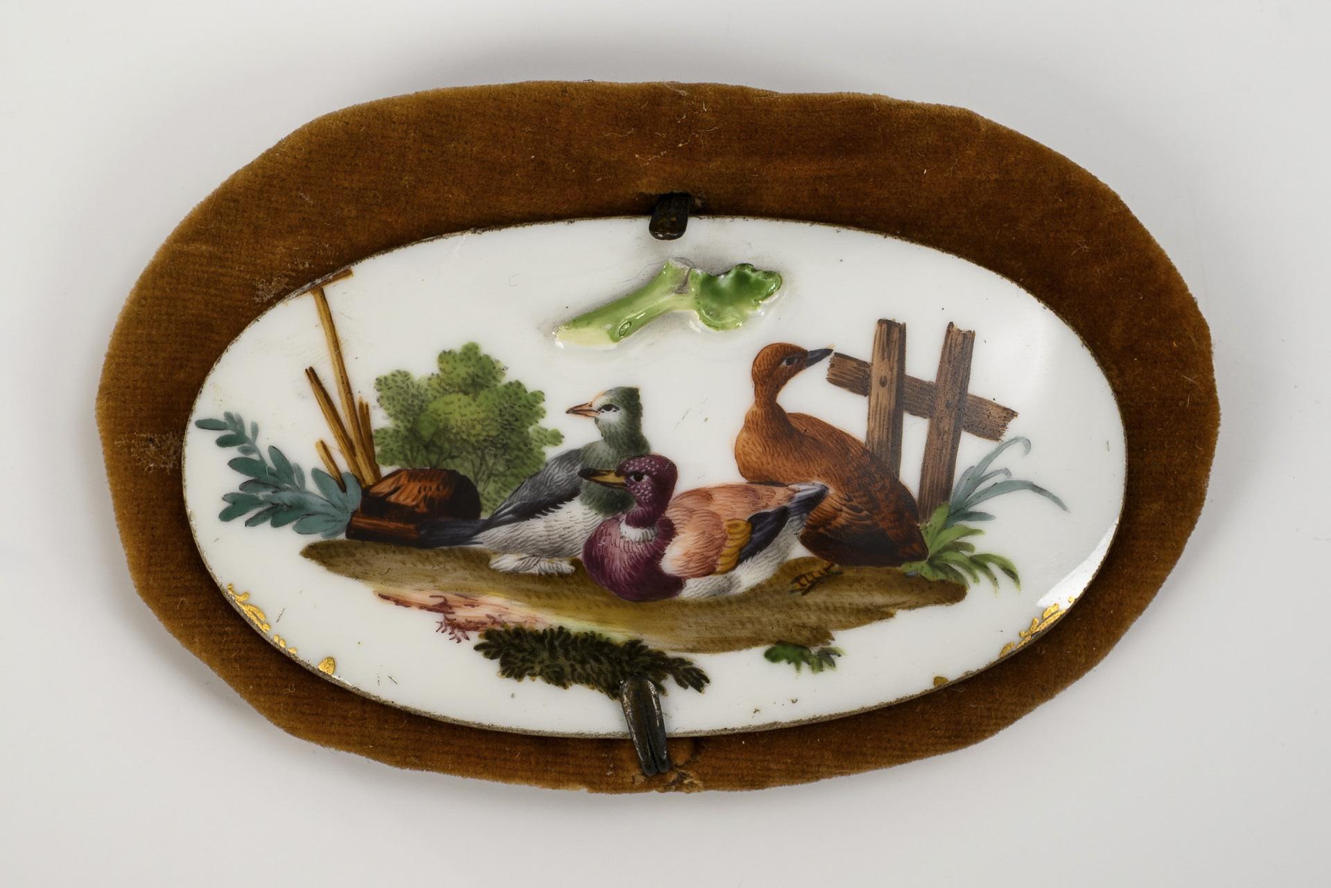 Ovale, wohl aus einer Schale ausgeschnittene Plakette mit der Darstellung einer Landschaftsinsel mit Entengruppe. Auf Samtunterlage