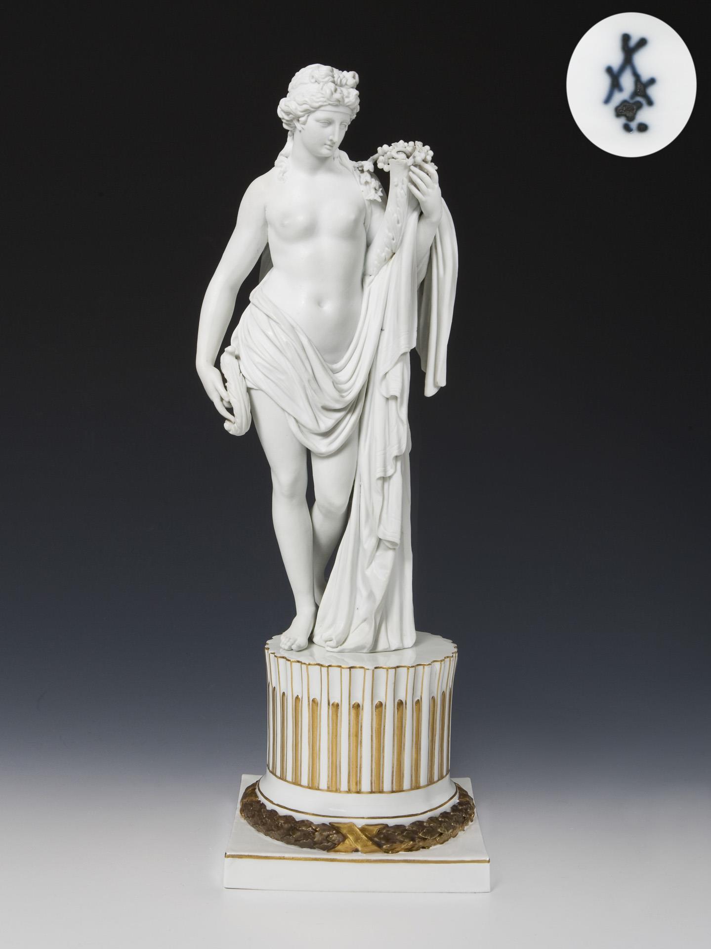 Modell von Christian Gottfried Jüchtzer und Mitarbeiter. Fortuna ist die Glücks- und Schicksalsgöttin der römischen Mythologie. Weißporzellan und Biskuitporzellan, das montierte Postament gold staffiert. Goldene Malermarke, Schwertermarke mit Stern