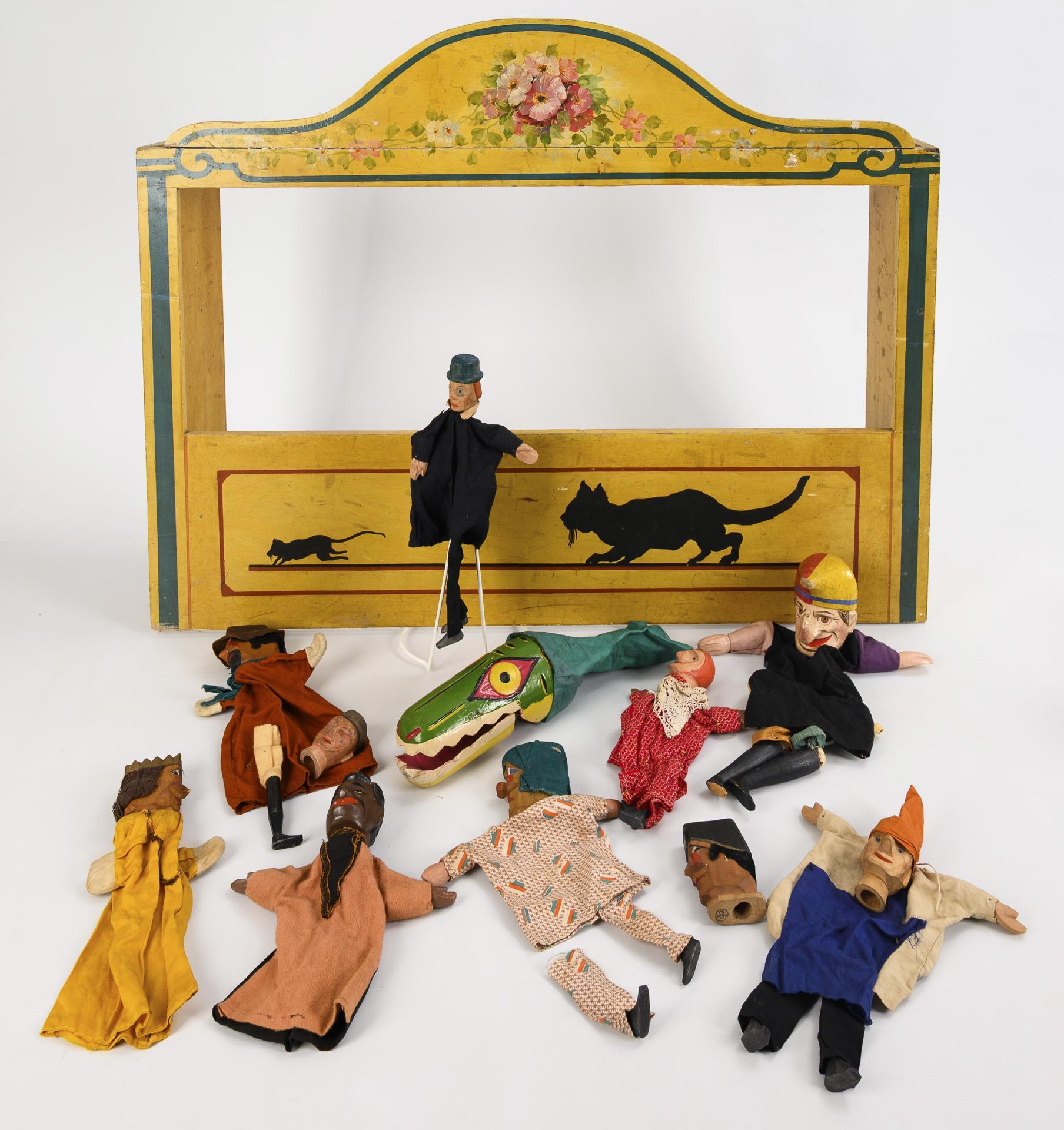 Gelb gestrichene Bühne mit Blumendekor, ohne Vorhang (76 x 100 x 22 cm). Dazu 9 defekte Handpuppen sowie einige lose Köpfe
