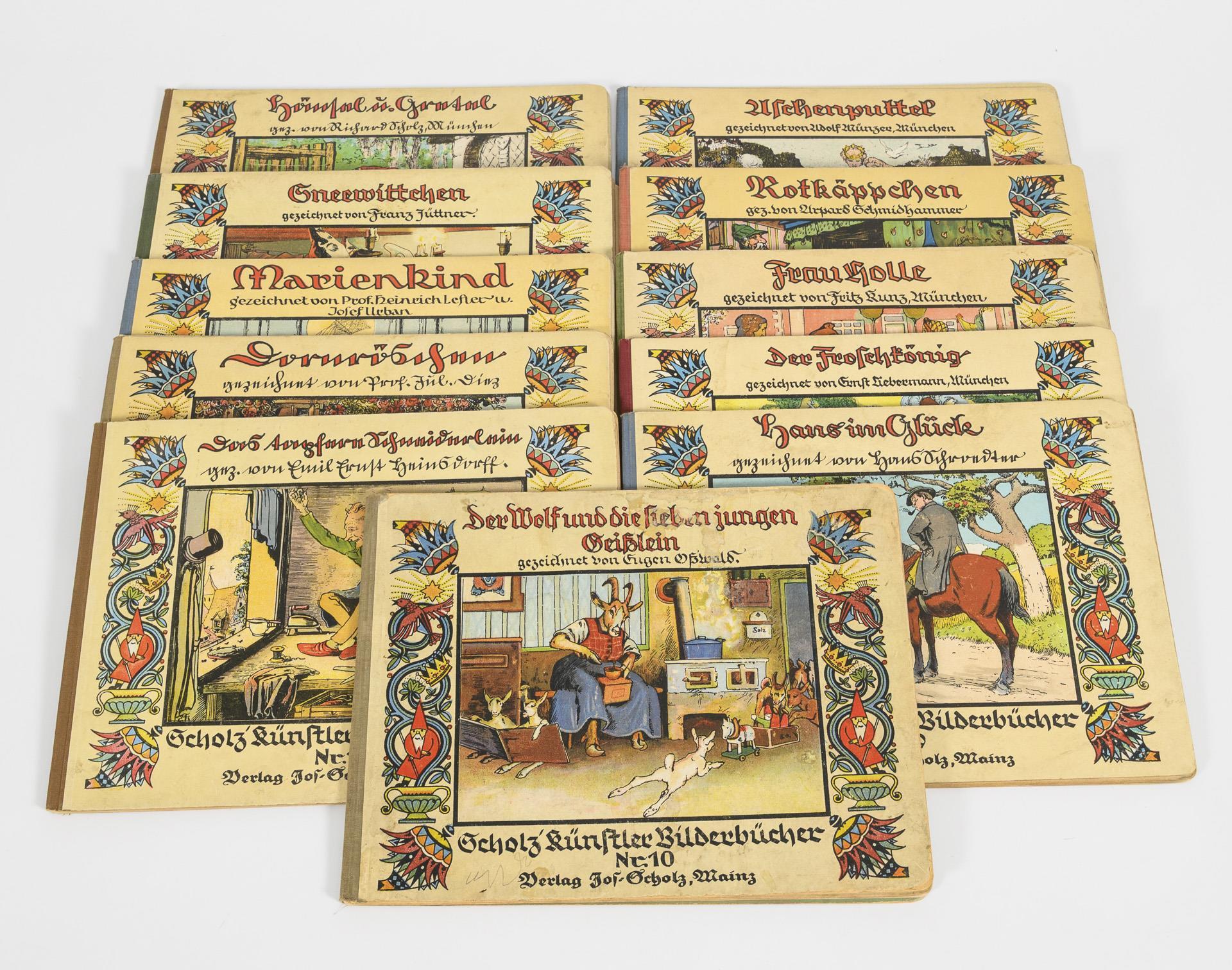 Nr. 1, Dornröschen, gezeichnet von Julius Diez / Nr. 2, Marienkind, von Heinrich Lefler und Josef Urban / Nr. 3, Aschenputtel, von Adolf Münzer / Nr. 4, Rotkäppchen, von Arpard Schmidhammer / Nr. 5, Hänsel und Gretel, von Richard Scholz / Nr. 6, Sneewittchen (sic), von Franz Jüttner / Nr. 7, Frau Holle, von Fritz Kunz / Nr. 8, Der Froschkönig, von Ernst Liebermann / Nr. 9, Hans im Glück, von Hans Schroedter / Nr. 10, Der Wolf und die sieben jungen Geißlein, von Eugen Wolf / Nr. 16, Das tapfere Schneiderlein, von Emil Ernst Heinsdorff. Alle im Halbleineneinband