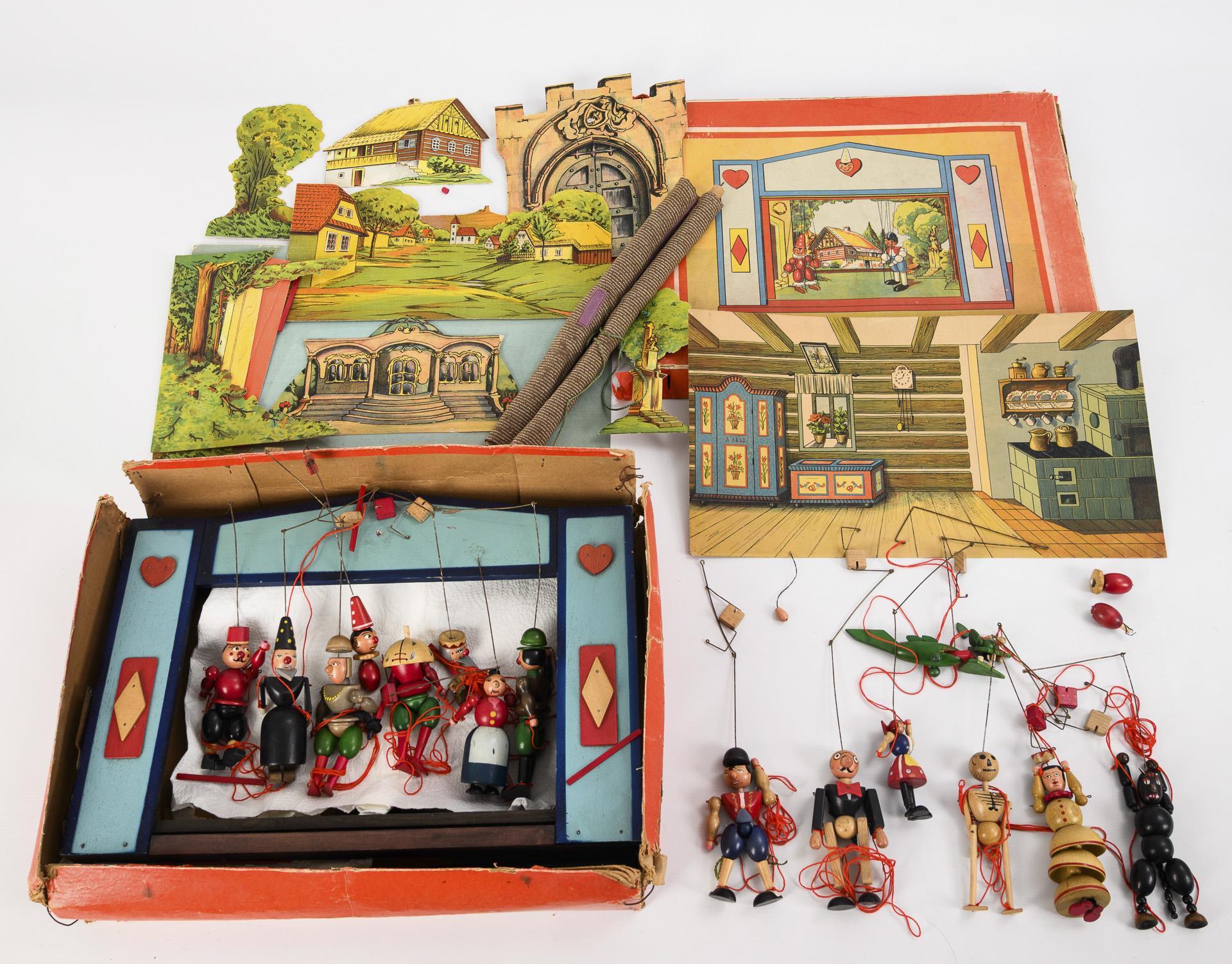 Möglicherweise von J. Schowanek oder Kellner hergestellt. Holzkulisse mit farbig bedruckten Szenen aus Pappe. Dazu 14 kleine Holzmarionetten, die teilweise von Oskar Schlemmer inspiriert zu sein scheinen. In rotem Originalkarton