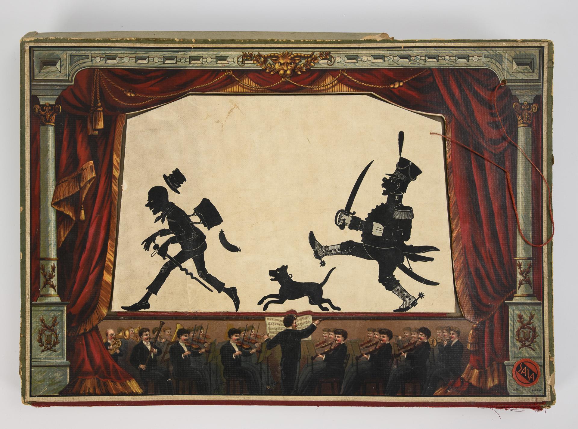 Farbig lithografierter Bühnenkasten mit gerollten Schattenbildern, die mittels Handkurbel bewegt werden. Mit intakter Spieluhr, dazu ergänzter Schlüssel