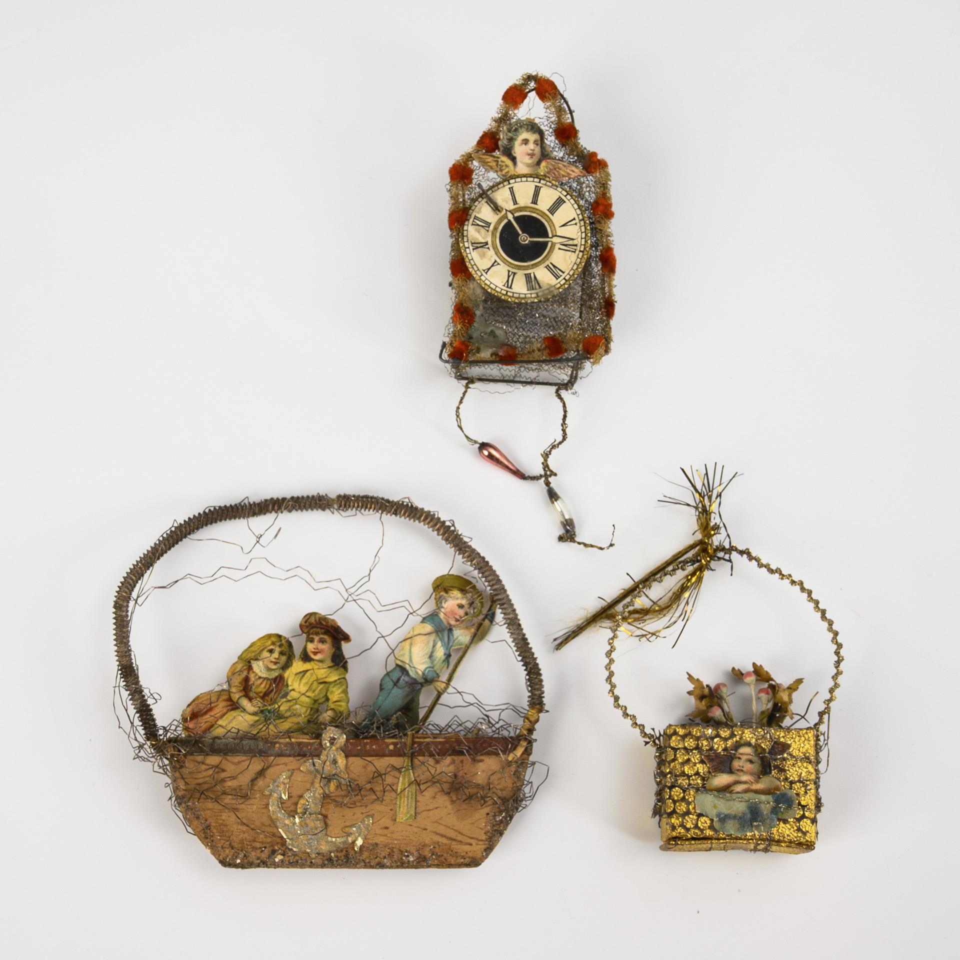 Für den Weihnachtsbaum. Schiff mit Kindern, Wanduhr und goldener Blumenkorb