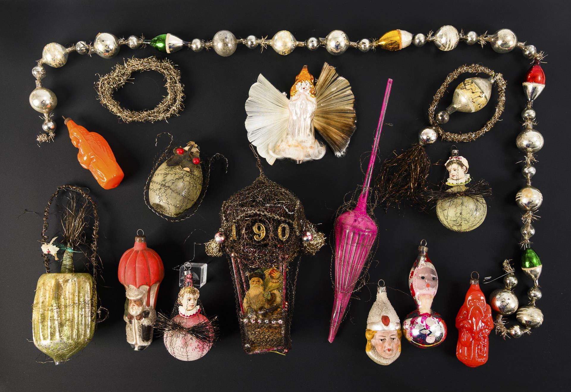 14 Teile Christbaumschmuck, teils mit leonischen Drähten.