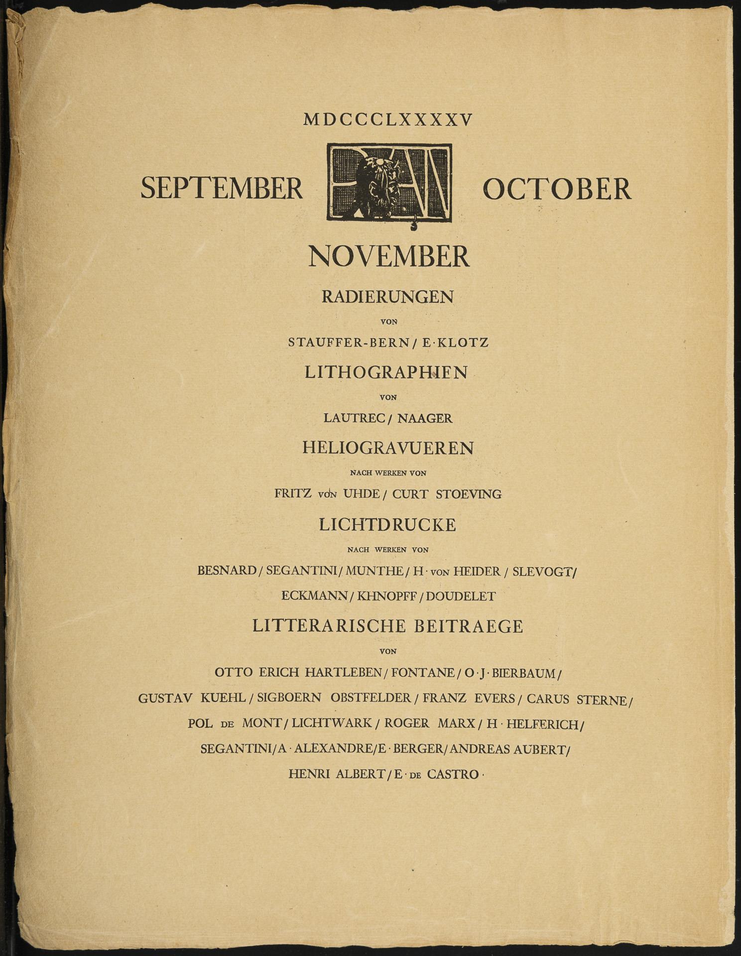Deckblatt und Inhaltsverzeichnis von 1895. Blätter unterschiedlichster Drucktechniken, unter anderen von Emil Orlik, E. Kirchner, Peter Halm, Max Klinger, Max Liebermann, Graf von Kalckreuth, Otto Ubbelohde, Peter Behrens, Walter Leistikow und vielen anderen
