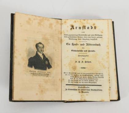 400 Seiten mit Bildnis Fürst Günther Friedrich Carl und einer Ansicht von Arnstadt. Eingeklebter Brief von Voelker. Im goldgeprägten Halbledereinband