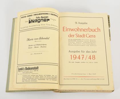 51. Ausgabe, Erscheinungstag 1. Mai 1947. Einwohnerbuch der Stadt Gera. Mit Aufstellungen über Firmen, Einwohnerverzeichnis, Straßenverzeichnis, Bezugsquellenverzeichnis und Behörden. Im Halbleineneinband