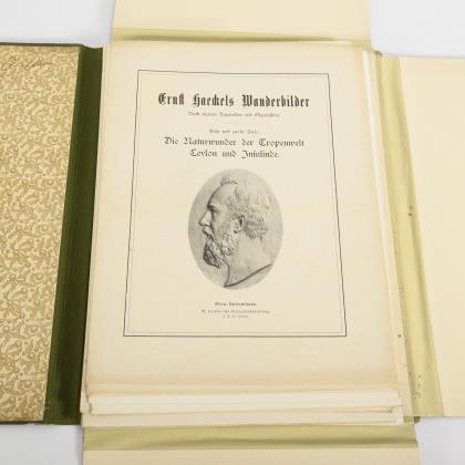 8 Seiten Vortext, 40 Farbtafeln nach Zeichnungen von Haeckel selbst, mit je einer zweiseitigen Beschreibung mit weiteren Abbildungen. Lose Blätter in farbig geprägter Originalmappe