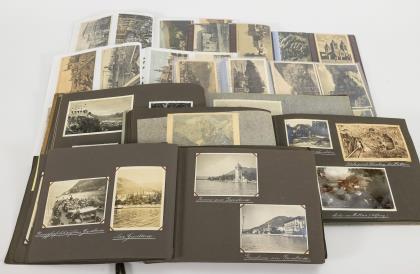 Viele Symbolkarten, aber auch Rückwärtige Dienste (Militärhunde, Bäckerei)), Zeppelin, Eisenbahnbrigade und Studiofotos. Kleines graues Album "Kriegserinnerungen" mit Eisernem Kreuz sowie grüner Ordner