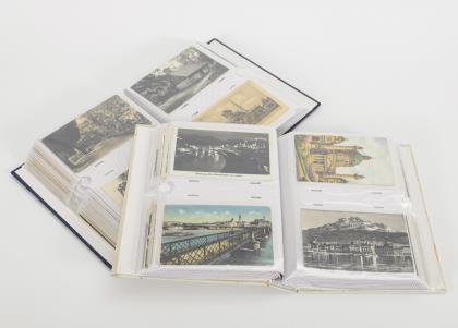 Vorwiegend Schwarz/weiß-Abbildungen, meist 1. Hälfte 20. Jahrhundert. Im modernen orangen Album mit Blättern