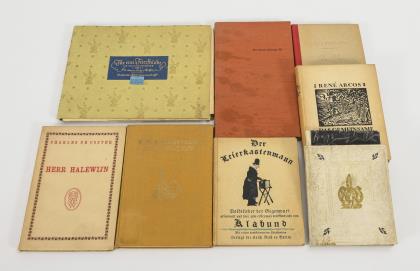 "Für eine Feierstunde - Die Weihnachtsgabe", Deutsche Buchgemeinschaft 1930, mit 6 handsignierten Radierungen von Hans Meid. / Karl Leopold Mayer: "Der Dichter Tschang-Tsi", Maximilian-Gesellschaft, Berlin 1933, nummeriertes Exemplar 175/300, im Leineneinband (fleckig). / E.T.A. Hoffmann: "Das Gelübde", Hesperos Verlag, München, nummeriert 198/500, mit Radierungen und einer Signatur von Charlotte Christine Engelhorn, im Leineneinband. / Charles de Coster: "Herr Halewijn", Arthur Wolf Verlag, Wien 1921, 1400 Exemplare auf handgeschöpftem Bütten, Originalholzschnitte von Carl Pauer-Arlau, im Pappeinband. / Klabund: "Der Leierkastenmann - Volkslieder der Gegenwart", Verlegt bei Erich Reiß, Berlin 1917, mit 10 kolorierten, ganzseitigen Holzschnitten von Szafranski, im Pappeinband. / René Arcos: "Das Gemeinsame", übertragen von Friderike Maria Zweig, Insel-Verlag zu Berlin, mi 27 Holzschnitten von Frans Masareel, 3400 Exemplare Gesamtauflage, im Pappeinband. / "Brüder Grimm - Jorinde und Joringel, Der Eisenhans, Der wunderliche Spielmann", "Dies wurde in der Lehrwerkstatt für Buchdruck an der Kunstgewerbeschule Halle im Jahr 1922 von Egon Roemer gesetzt und in einer Auflage von 100 Exemplaren gedruckt", im Halbpergamenteinband mit selbstgemachtem Buntpapier bezogen. / Paul Verlaine: "Louise Leclercq", Söcking 1948, bei Heinrich F.S. Bachmair, Mit Bildern von Bele Bachem, nummeriertes Exemplar 472/500. Im Halbleineneinband. / Fritz Groos: "Michael Gerimans Brautfahrt", Darmstadt 1922, Originalholzschnitte von Annelise Reichmann, nummeriertes Exemplar 24/200, im Auftrag der Gesellschaft Hessischer Bücherfreunde, im goldgeprägten Pergamenteinband
