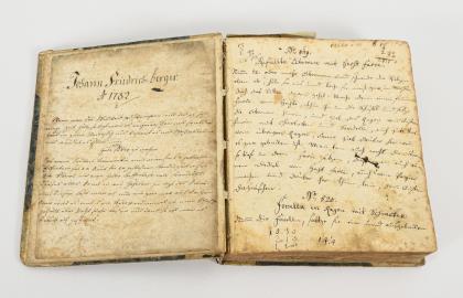 Wohl 524 Rezepte in einheitlicher Handschrift und viele weitere Rezepte ohne Nummerierung und von anderer Hand. Davon ca. 54 Rezepte für Kuchen und Torten. Wohl gehobenere Küche. Im Vorsatz: "Johann Friedrich Berger A. 1782". Das Buch stammt aus Schwabach bei Nürnberg, das zum Markgrafentum Ansbach gehörte, nach Information des Einlieferers. Die Rezepte beginnen mit der Nr. 519. Halbpergamenteinband
