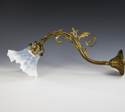 Gabelförmiger Fuß mit Jugendstil-Relief, Rundschaft, aufgesetzter Arm mit feststellbarem Gelenk für die Fassung. Pilzförmiger Schirm mit Sternschliff