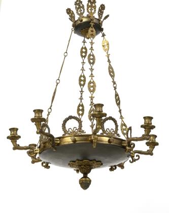 Zentrale Messingschale mit Zapfenabhängung, 8 Volutenarme mit Vasentüllen, 3 Zierketten mit Palmettengliedern, ähnlich der Hauptschale geformter Baldachin mit 8 Bekrönungen in Kranzform