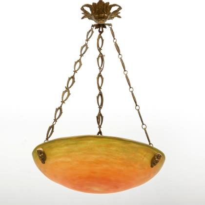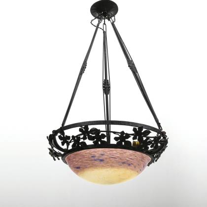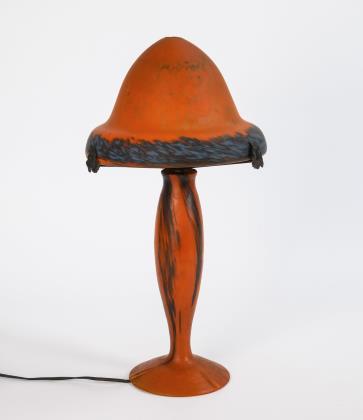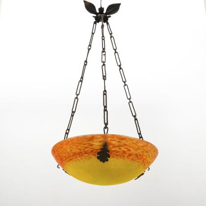 Patinierter Bronzefuß mit stilisiertem floralem Dekor und 3-armiger Schirmhalterung. Schirm aus dickwandigem farblosem mattiertem Glas mit Pulvereinschmelzungen in Violett- und Orangetönen, seitlich drei Bohrungen. Geschnittene Signatur Daum Nancy mit Lothringer Kreuz. Alt elektrifiziert, drei Lichtquellen, eine Glühlampe vorhanden