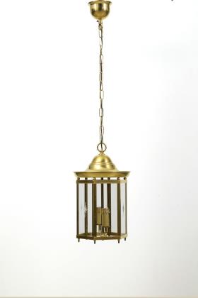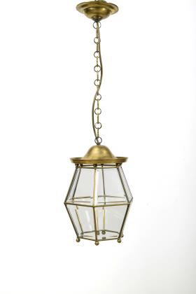 Hexagonale Lampe je mit Sternschliff an der allseitigen Verglasung; innen 2 Fassungen mit Pappkerzenhülsen. Glockenförmigem Dach, Kette, Halbkugel-Baldachin mit kurzem Schaft