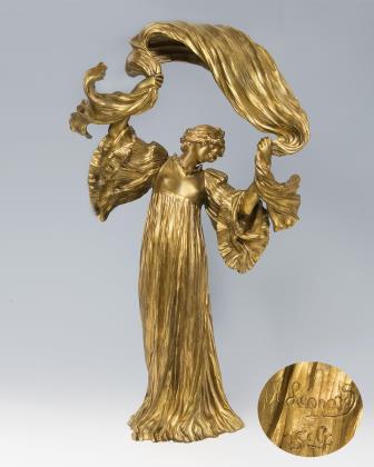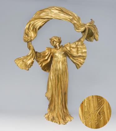Künstler-Signet, Gießerstempel: Susse Freres Editeurs Paris, darunter eingeschlagen der Buchstabe M. Elektrifiziert, eine Lichtquelle. Figur aus der Serie "Jeu de l'écharpe" von 1897. Die Figuren wurden auch in Sévres-Porzellan in verschiedenen Größen hergestellt, die Gießerei Susse Freres sicherte sich 1901 die Bronzeproduktion. Für die Figur wurde Léonard von der Tänzerin Loie Fuller, alias Marie Louise Fuller (1862-1928) inspiriert, sie war die erste Tänzerin, die elektrisches Licht bei ihren Schleiertänzen einsetzte.