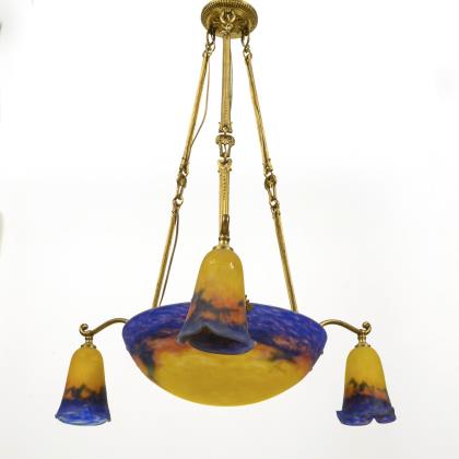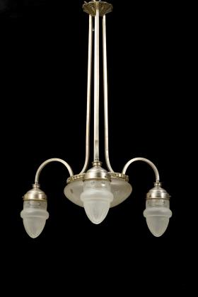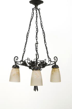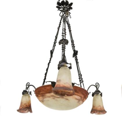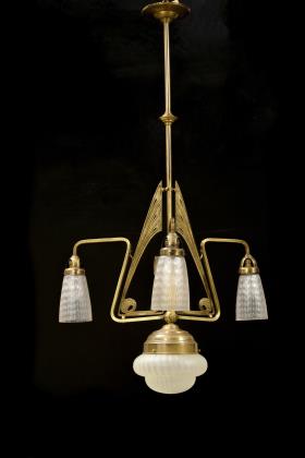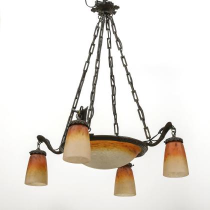 4-flammige Art déco Deckenlampe mit einer zentralen Flamme in einer schmiedeeisernen, schalenförmigen Aufnahme mit verschiedenfarbigen Mosaik-Buntglasstücken sowie zwei Metallapplikationen. Drei weitere Flammen sind an ornamentierten Ketten von der zentralen Einheit abgehängt und schließen in glockenförmigen Messingtüllen ab. Die Aufhängung erfolgt über Ketten an einem abgestuften, runden Baldachin aus Messing