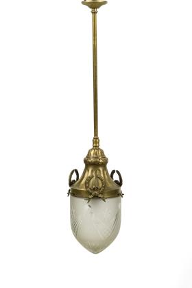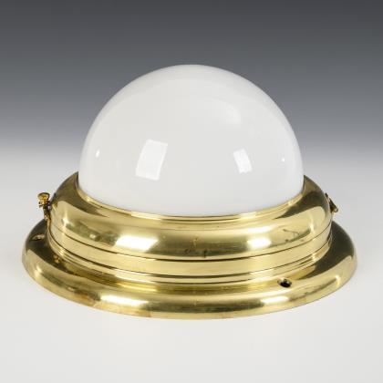 1-flammige Milchglaskugel mit durchsichtigem Glasüberfang, an Messingmontierung mit kegelförmigem Baldachin