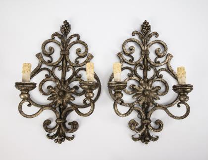 Aufwändig in der Art des Barock geschmiedete Wandhalterungen mit Voluten und zentraler Blütenrosette. Volutenarme mit aus Holz gedrechselten Tüllen für die elektrischen Kerzen mit Papp-Kerzenhülsen