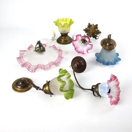 Mit Zungenblättern reliefierte Wandhalterung, Schirmhalterung mit Zierfries, Schirme in Form von Lanzetttulpen u.a. mit Steinelschliff