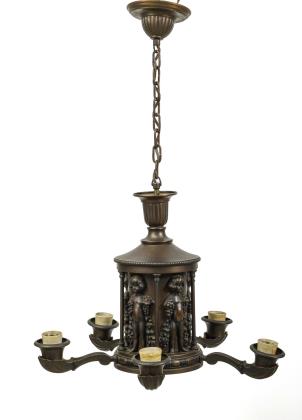 5-flammiger Leuchter mit vegetabil ornamentiertem Baldachin und zentralem Stab, von dem fünf bogenförmige, mit Sphingen besetzte Arme mit vertikalem Abschluss ausgehen und die Flammen mit Messingtüllen tragen