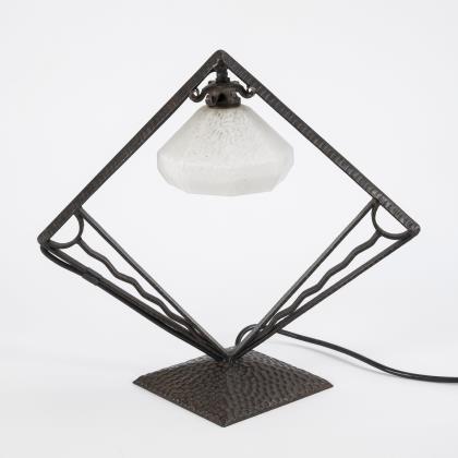 Art-déco-Tischlampe mit quadratischem Schirm.