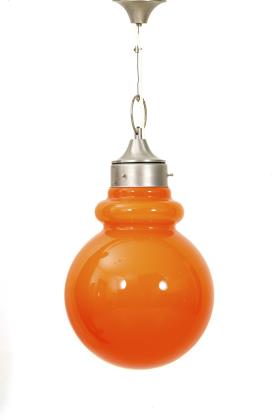 Große Design-Lampe mit orangem Schirm.