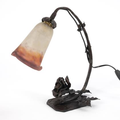 Geschmiedeter Rosenzweig mit großer Blüte an der martellierten Grundplatte, stängelartiger Schaft mit Blattbesatz sowie Kelchblättern am glockenförmigen Glasschirm mit dreifach gekniffenem Rand