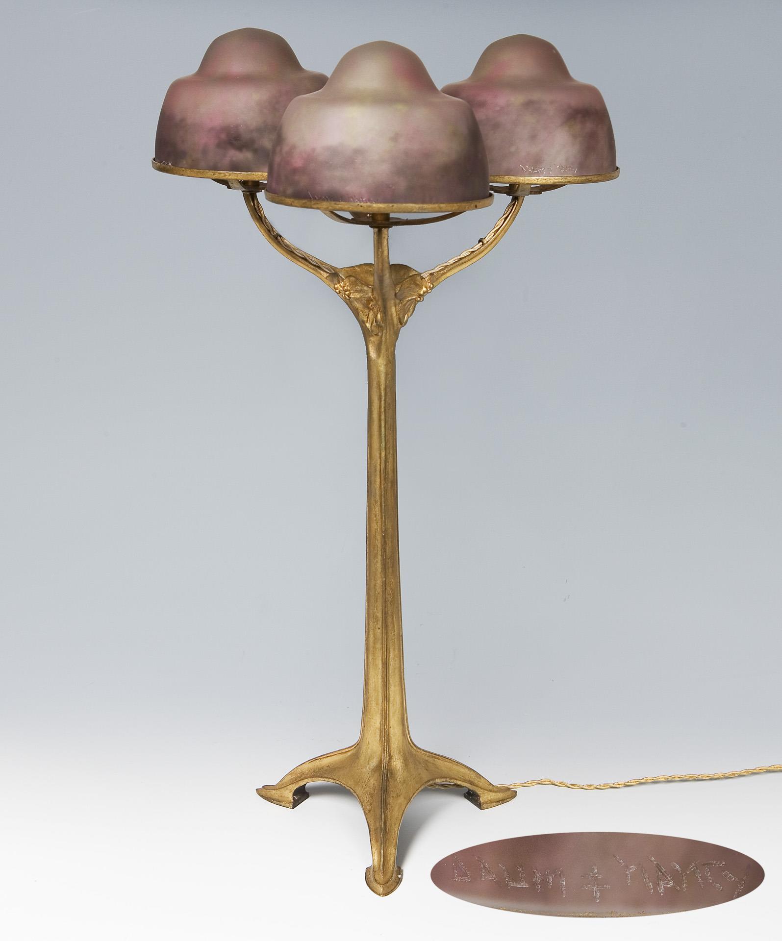 Ehemals vergoldeter Bronzefuß mit reliefiertem floralem Dekor und 3-armiger Schirmhalterung. Schirme aus dickwandigem farblosem mattiertem Glas mit Pulvereinschmelzungen in Violett, Gelb und Grün. Geschnittene Signaturen Daum Nancy mit Lothringer Kreuz, alt elektrifiziert, drei Lichtquellen