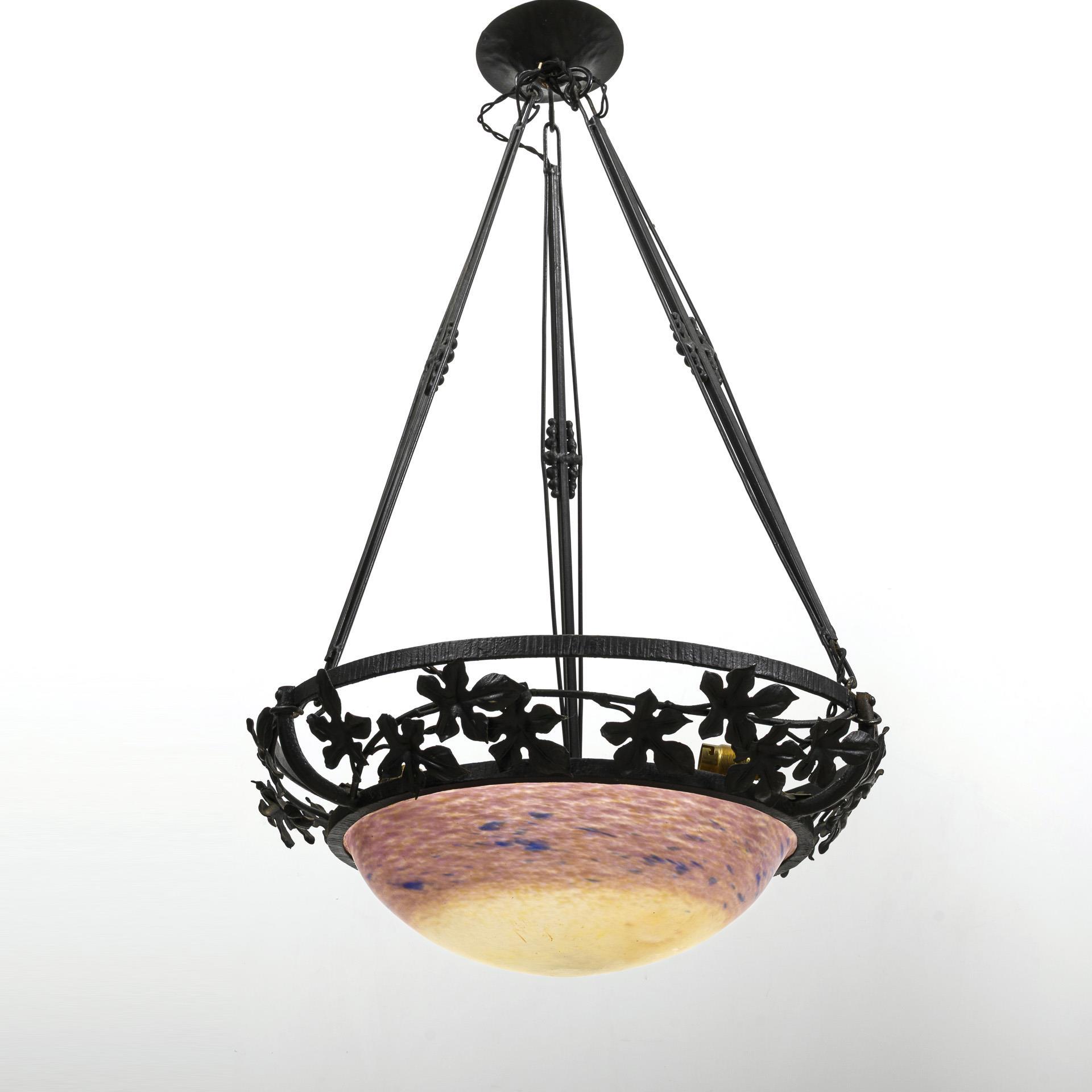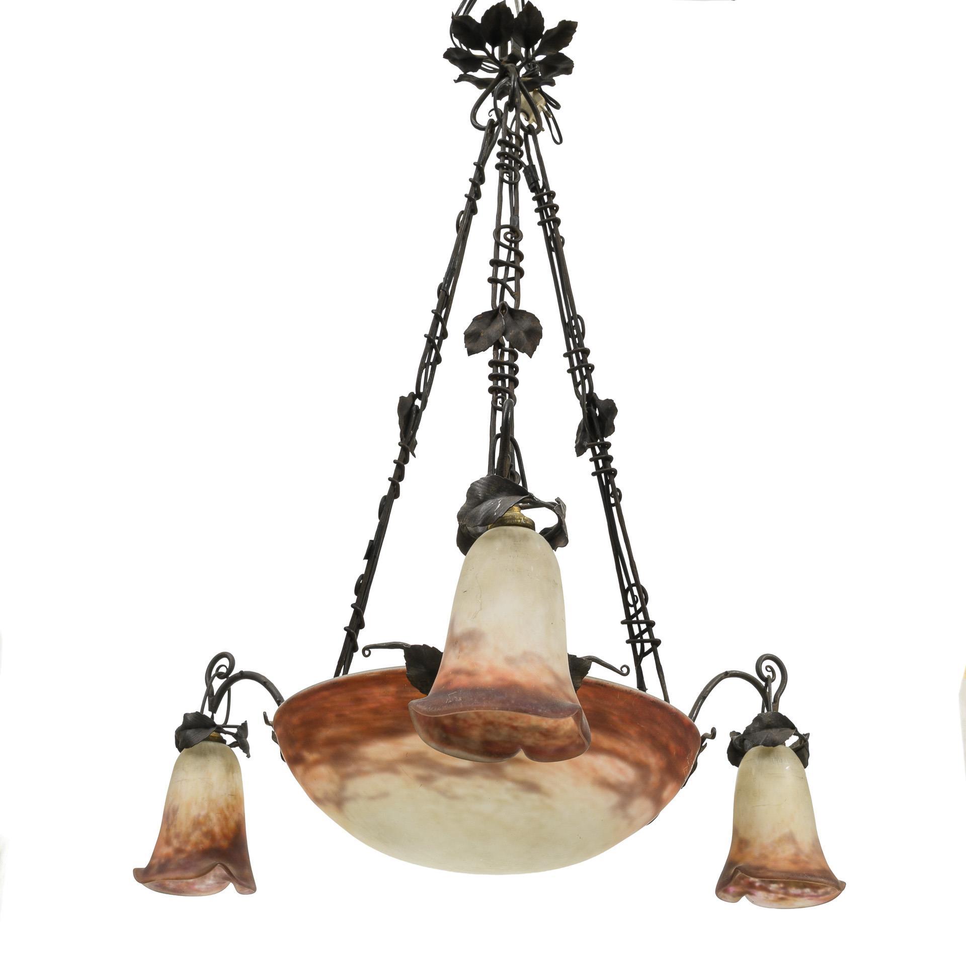 3-flammige Deckenlampe in Form eines zusammengebundenen Bündels aus schmiedeeisernem Weinlaub, aufgehängt an Ketten, die in einem runden, konisch geformten Baldachin zusammenlaufen. An drei der Weinlaubzweige sind mattierte und signierte Glasschirme angebracht, die ein Zwischenschichtdekor aus weißen Pulvereinschmelzungen aufweisen, partiell überlagert von Pulvereinschmelzungen in gelb-orangenen Tönen