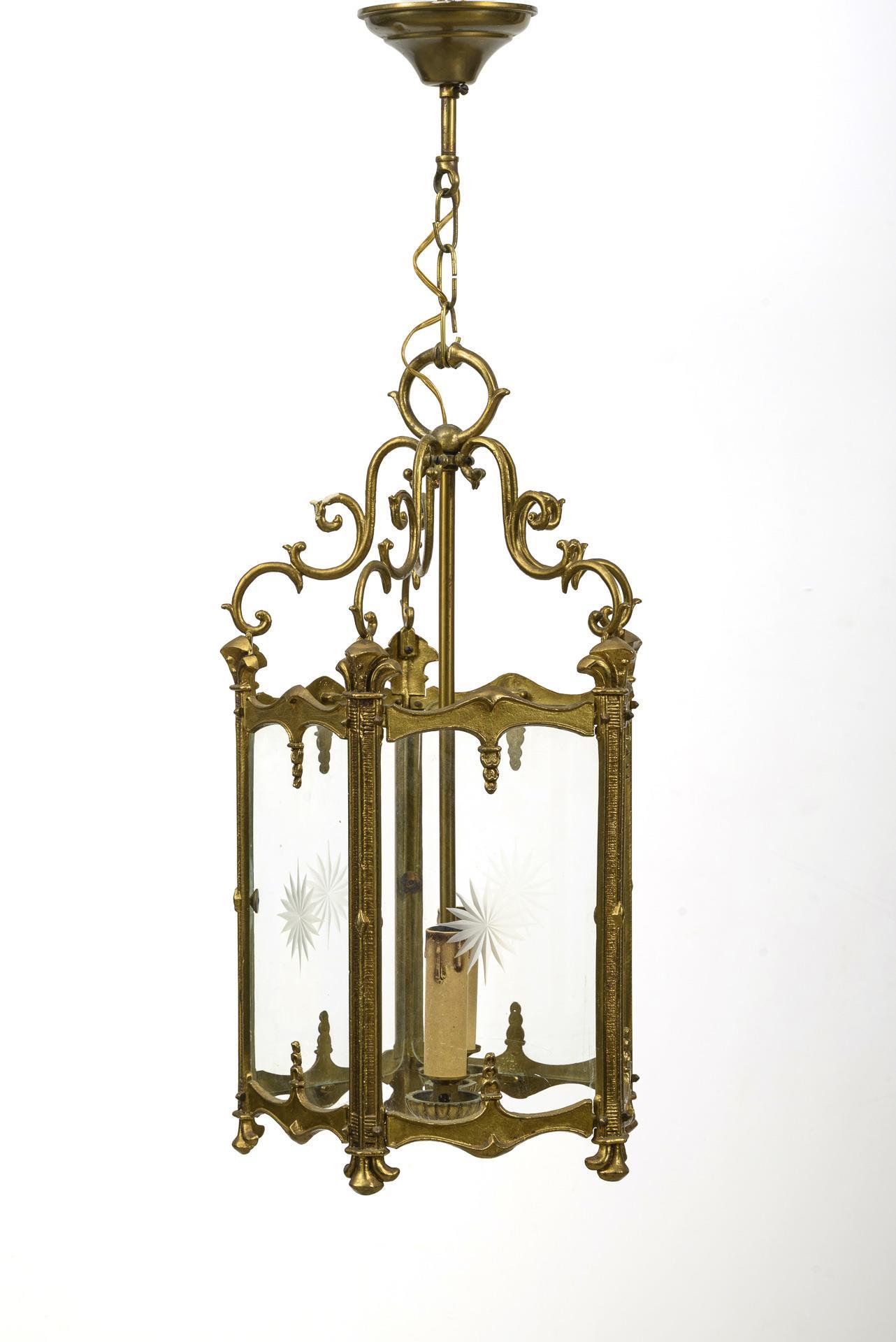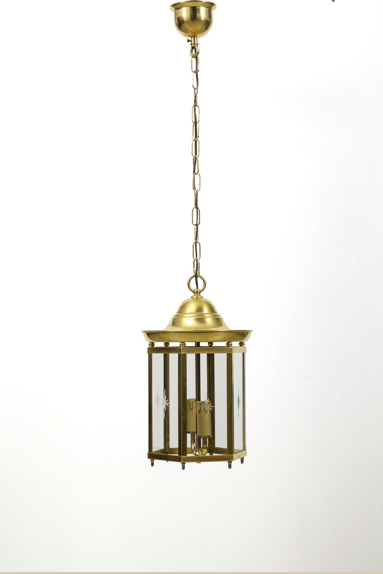 Hexagonale Lampe je mit Sternschliff an der allseitigen Verglasung; innen 2 Fassungen mit Pappkerzenhülsen. Glockenförmigem Dach, Kette, Halbkugel-Baldachin mit kurzem Schaft