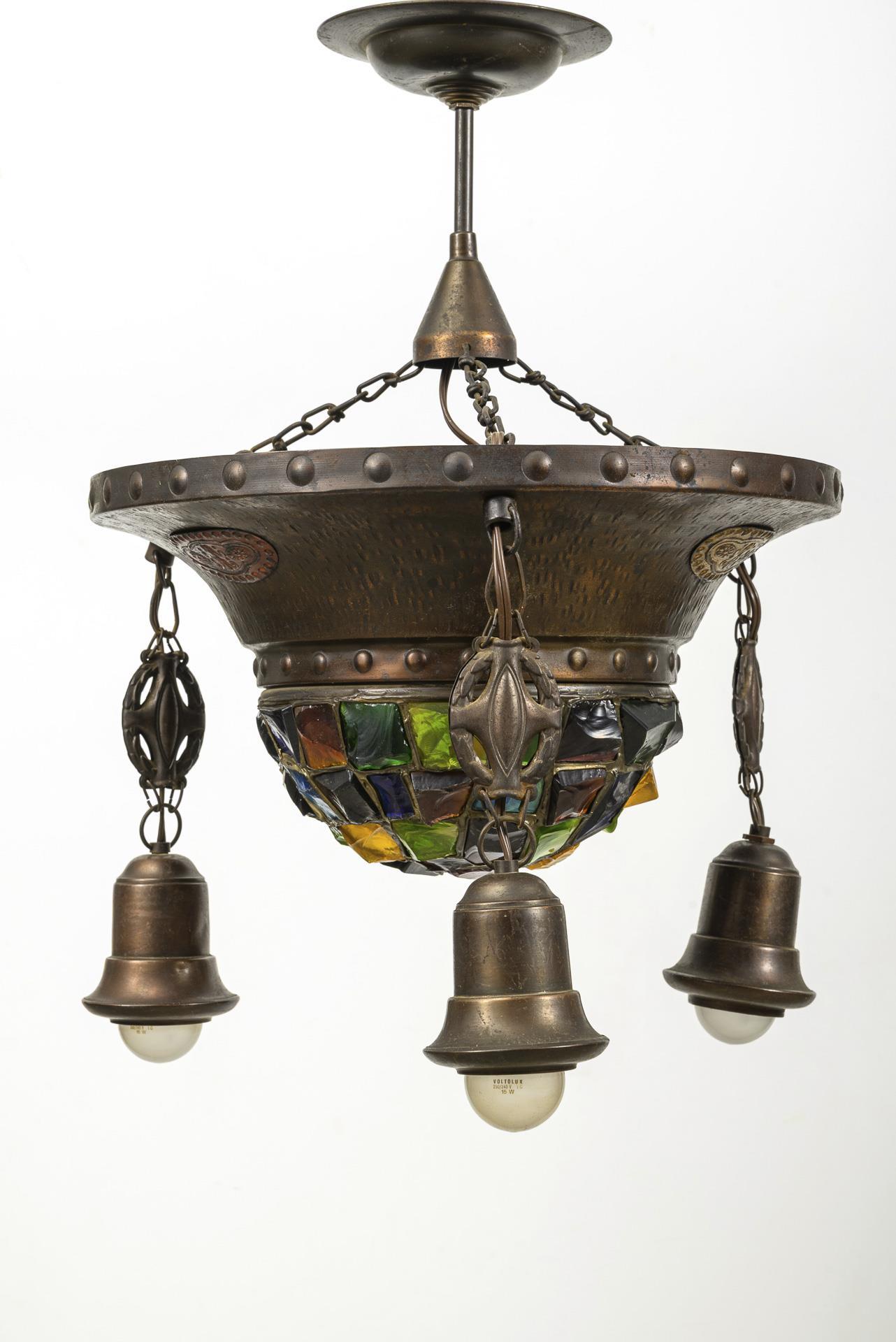 4-flammige Art déco Deckenlampe mit einer zentralen Flamme in einer schmiedeeisernen, schalenförmigen Aufnahme mit verschiedenfarbigen Mosaik-Buntglasstücken sowie zwei Metallapplikationen. Drei weitere Flammen sind an ornamentierten Ketten von der zentralen Einheit abgehängt und schließen in glockenförmigen Messingtüllen ab. Die Aufhängung erfolgt über Ketten an einem abgestuften, runden Baldachin aus Messing