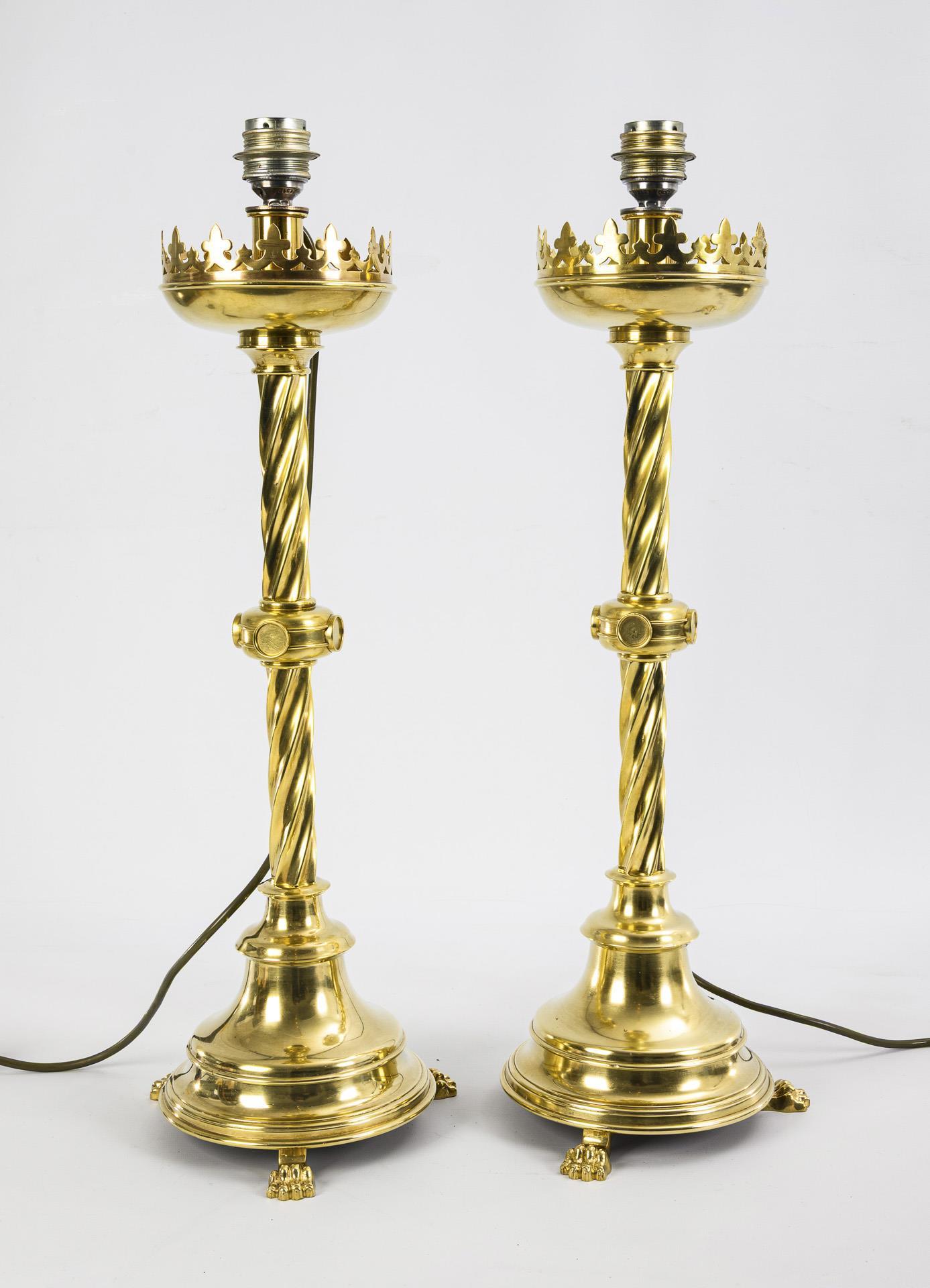 Paar große neugotische Leuchter als Tischlampen.