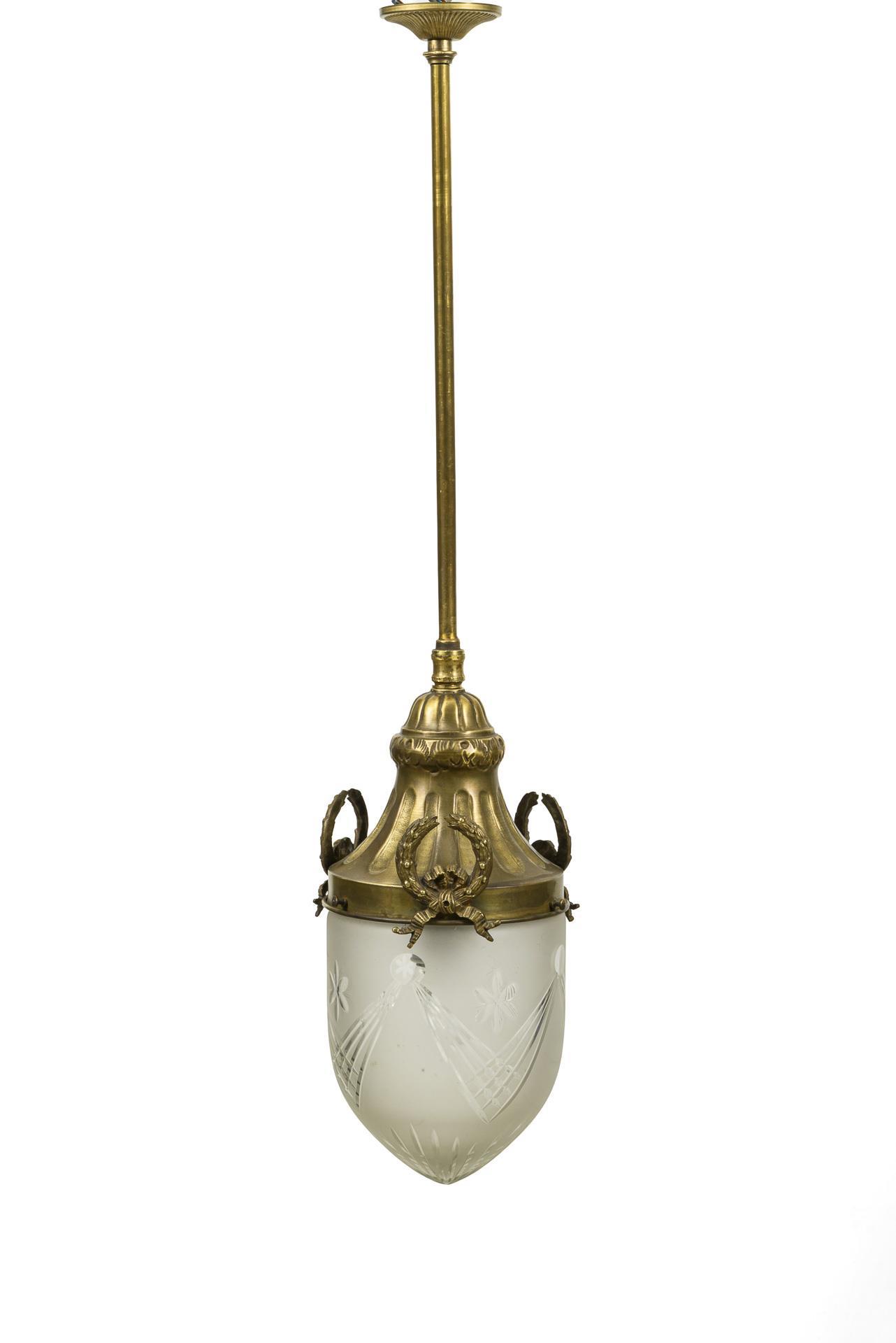 1-flammige Hängelampe mit eichelförmigem Schirm aus geätztem Glas, verziert mit Schliffdekor aus Linien und Blüten, an einer Messingaufhängung mit Kranzdekor, langer Strebe und rundem Baldachin