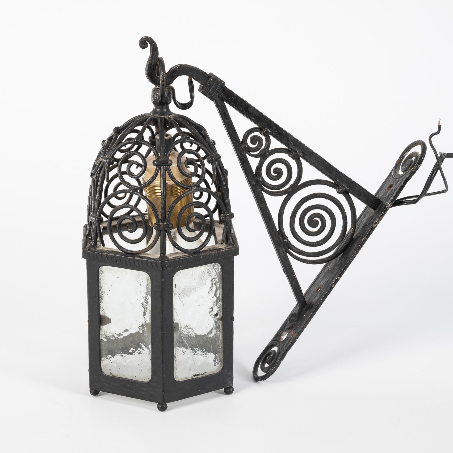 Allseits verglaste hexagonale Laterne mit geschmiedeten Voluten an der Haube. Wandhalterung mit Stützarm und gleichen Voluten verziert