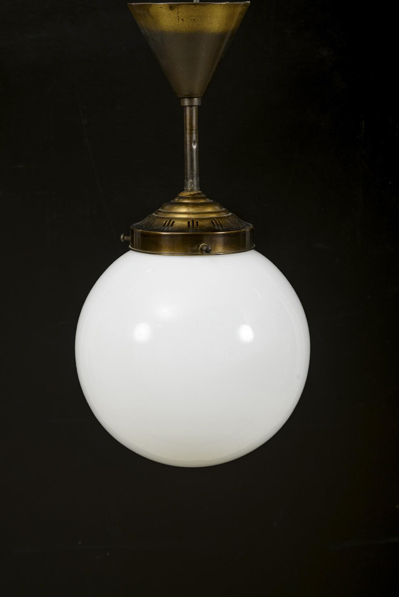 1-flammige Milchglaskugel mit durchsichtigem Glasüberfang, an Messingmontierung mit kegelförmigem Baldachin