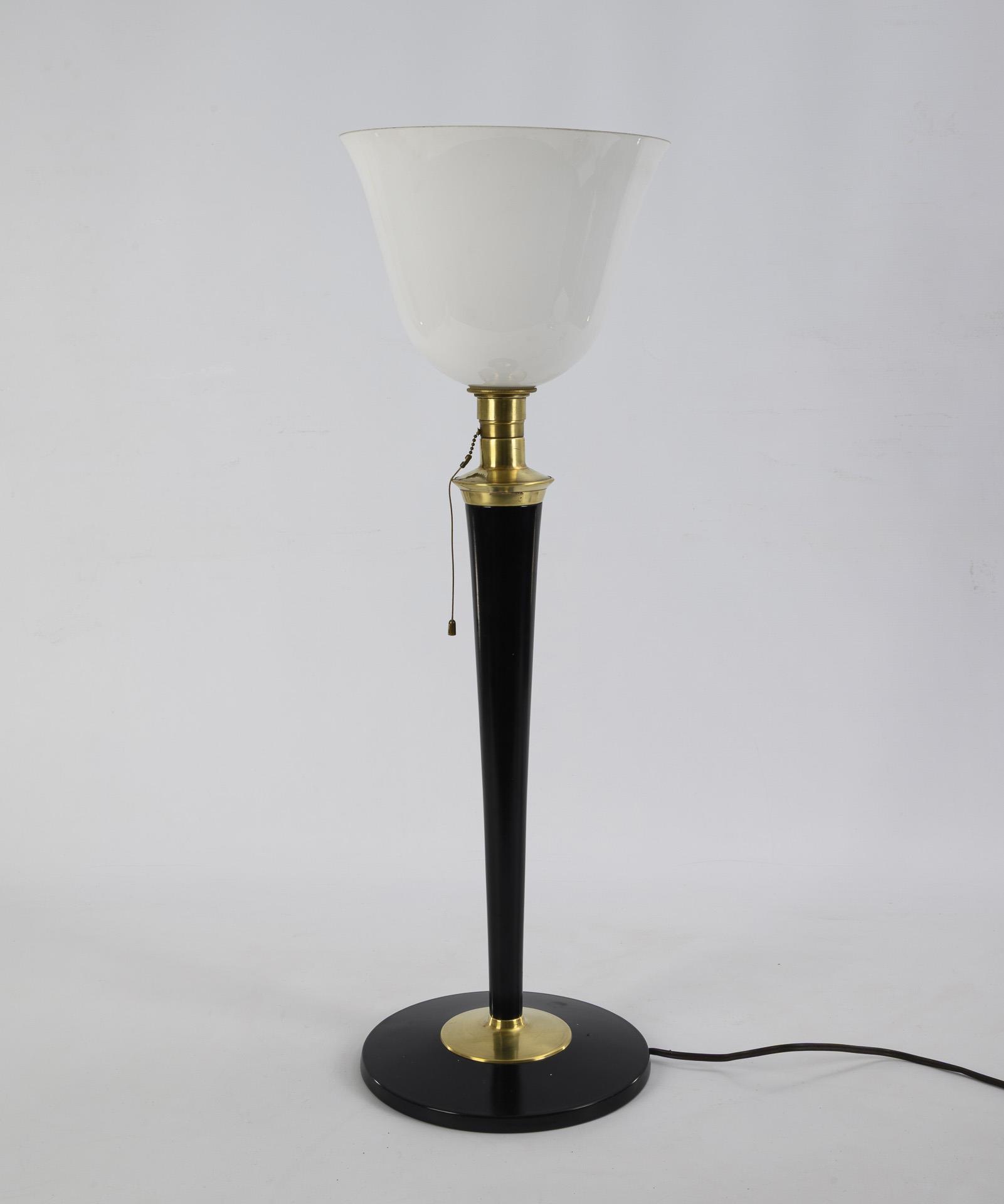 Design-Klassiker mit Rundfuß, konisch ansteigendem Schaft, Messing-Fassung und glockenförmigen Lampenschirm