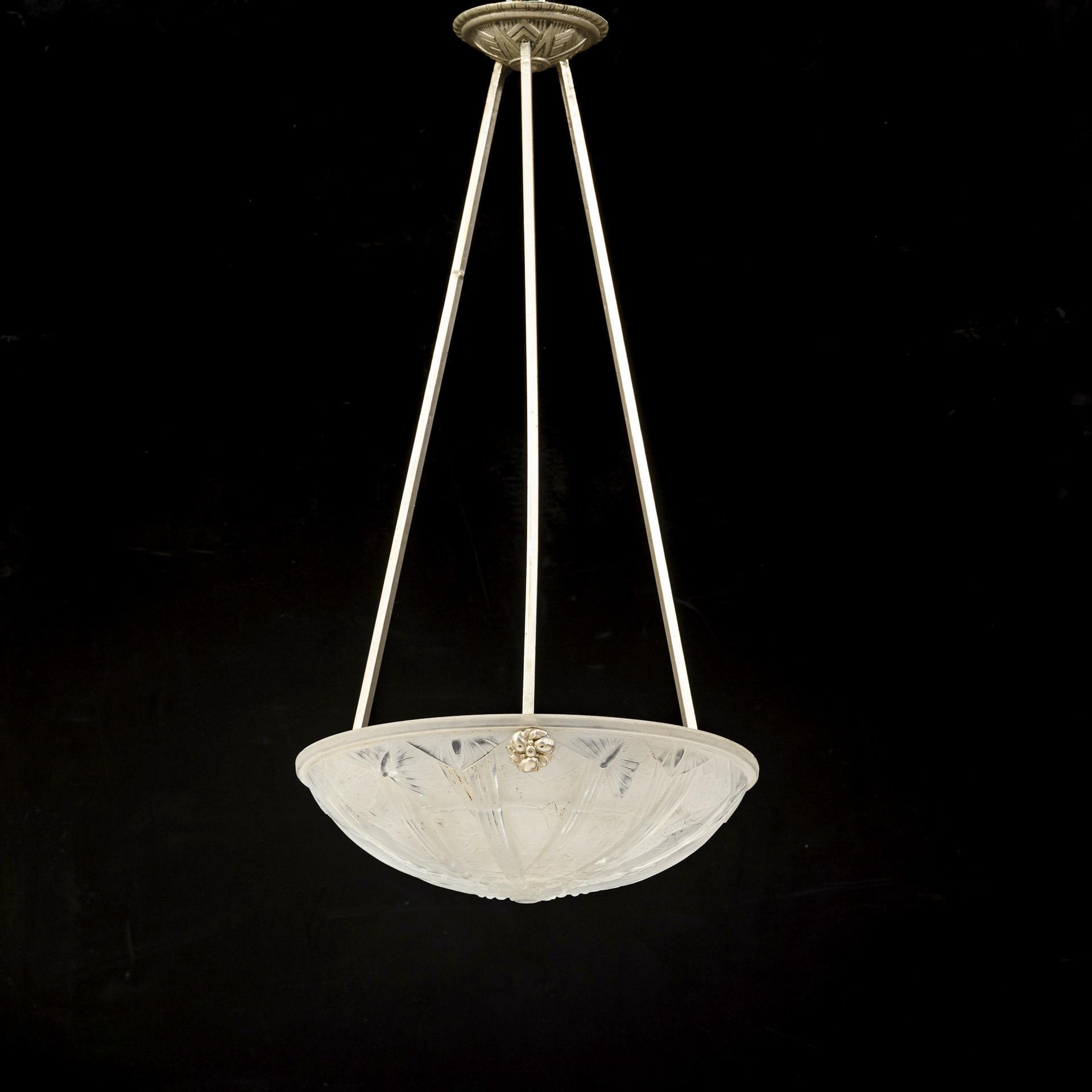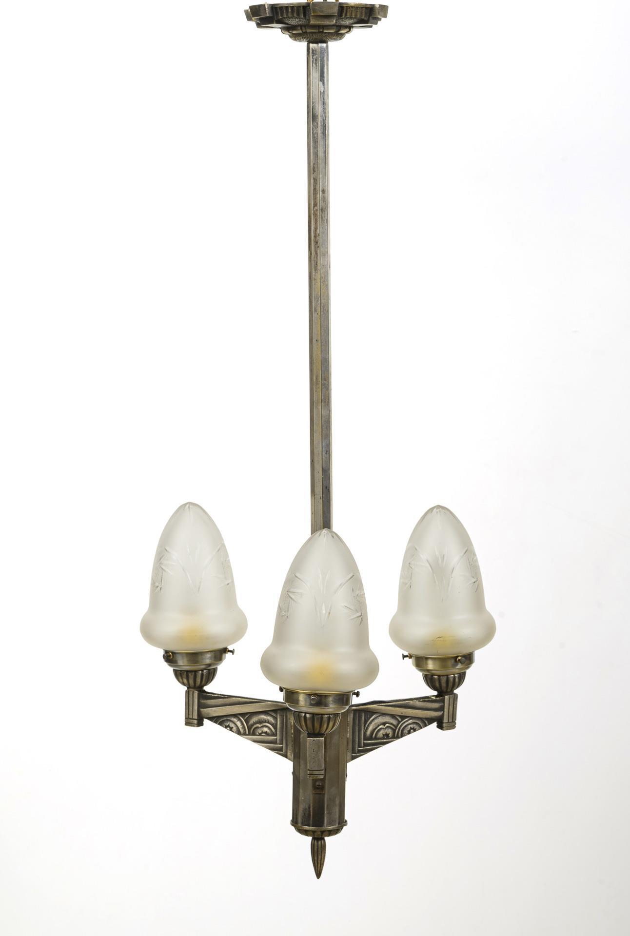 3-flammige Lampe an einem ornamentierten Baldachin mit Zentralstab. Von diesem gehen drei im Stil des Art déco gestaltete, vegetabil ornamentierte Arme aus, die knospenförmige, mattierte Glasschirme mit Kerbschnittdekor tragen